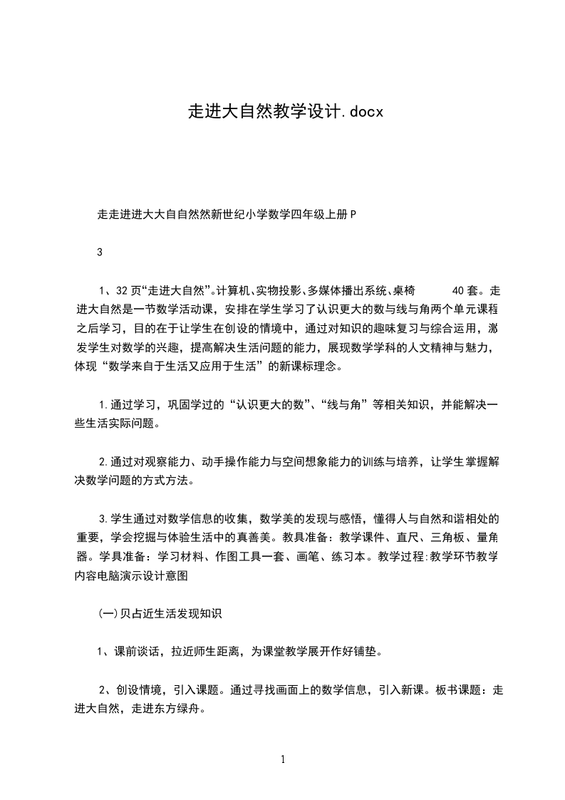 1、32页“走进大自然”。计算机、实物投影、多媒体播出系统、桌椅40套。走进大自然是一节数学活动课,安排在学生学习了认识更大的数与线与角两个单元课程之后学习,目的在于让学生在创设的情境中,通过对知识的趣味复习与综合运用,激发学生对数学的兴趣,提高解决生活问题的能力,展现数学学科的人文精神与魅力,体现“数学来自于生活又应用于生活”的新课标理念。