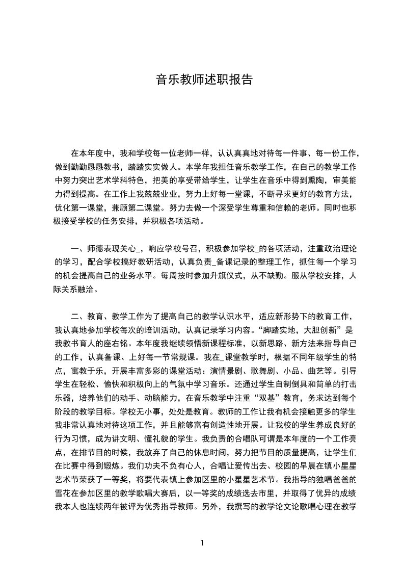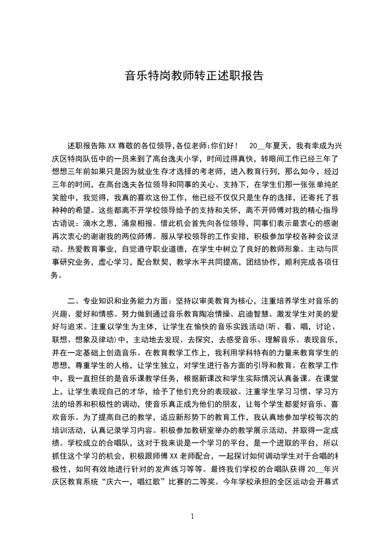 二、专业知识和业务能力方面:坚持以审美教育为核心,注重培养学生对音乐的兴趣、爱好和情感。努力做到通过音乐教育陶冶情操、启迪智慧、激发学生对美的爱好与追求。注重以学生为主体,让学生在愉快的音乐实践活动(听、看、唱,讨论、联想、想象及律动)中,主动地去发现、去探究,去感受音乐、理解音乐、表现音乐,并在一定基础上创造音乐。在教育教学工作上,我利用学科特有的力量来教育学生的思想,尊重学生的人格,让学生独立,对学生进行各方面的引导和教育。在教学工作中,我一直担任的是音乐课教学任务,根据新课改和学生实际情况认真备课。在课堂上,让学生表现自己的才华,给予了他们充分的表现欲。注重学生学习习惯、学习方法的培养和积极性的调动,使音乐真正成为他们的朋友,让每个学生都爱好音乐、喜欢音乐。为了提高自己的教学,适应新形势下的教育工作,我认真地参加学校每次的培训活动,认真记录学习内容。积极参加教研室举办的教学展示活动,并取得一定成绩。学校成立的合唱队,这对于我来说是一个学习的平台,是一个进取的平台,所以,抓住这个学习的机会,积极跟师傅XX老师配合,一起探讨如何调动学生对于合唱的积极性,如何有效地进行针对的发声练习等等。最终我们学校的合唱队获得20__年兴庆区教育系统“庆六一,唱红歌”比赛的二等奖。今年学校承担的全区运动会开幕式方阵表演,我协助师傅一起训练方队学生,在校领导和各位同事的共同努力下,方队表演在运动会上获得观众的掌声和领导的赞誉。不足之处:在教学中,尤其在教学欣赏课时,有时无从下手,不知让学生在欣赏课学点什么,分析曲式,对于小学生来说犹如听天书,根本听不懂。所以一到欣赏乐曲时,很多学生不能去关注乐曲,我想原因出在我身上,这也是我最大的困惑所在。以后会在音乐欣赏课方面多搜集一些资料,找寻合适的教学方法,让学生有兴趣的去听、想和创造。