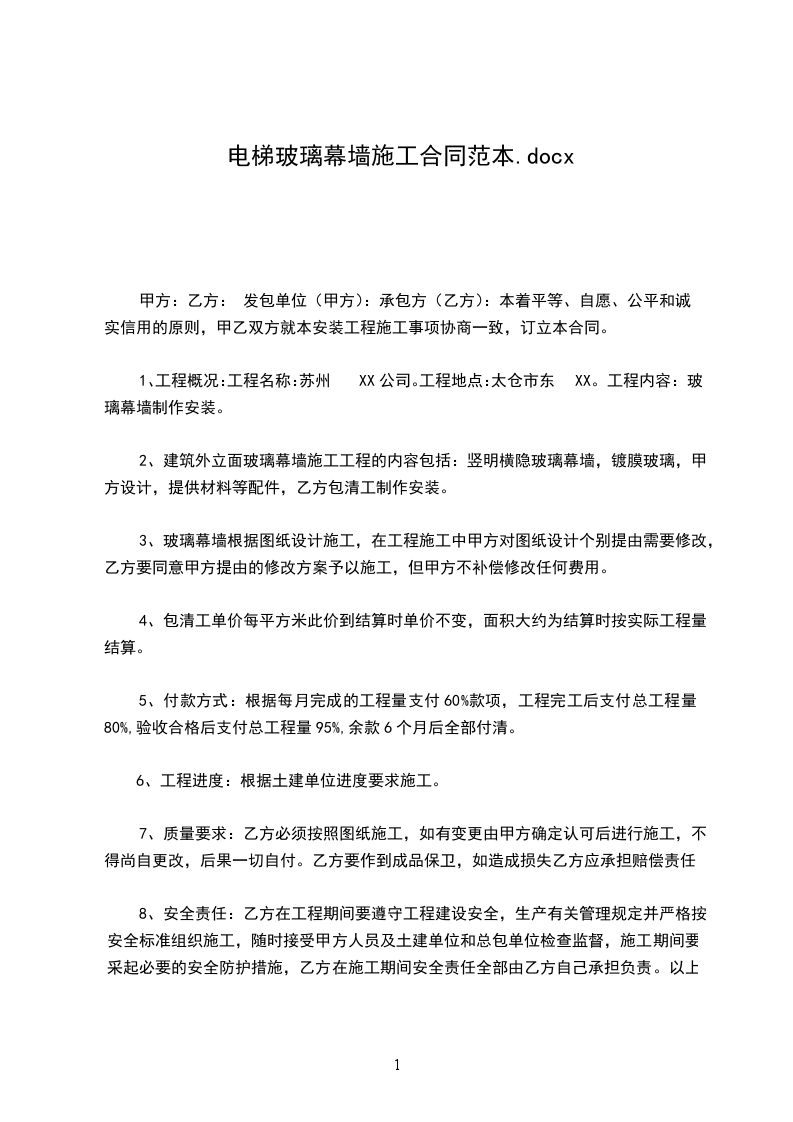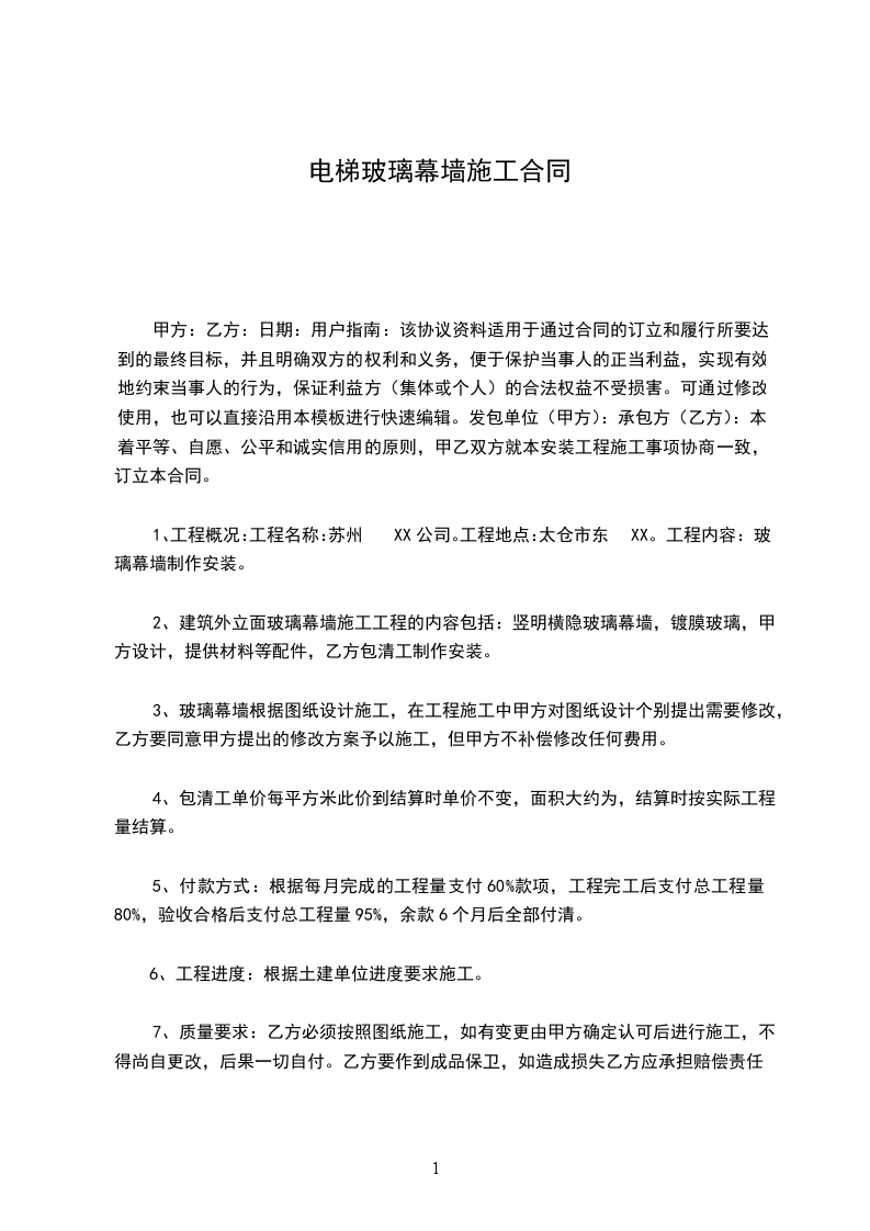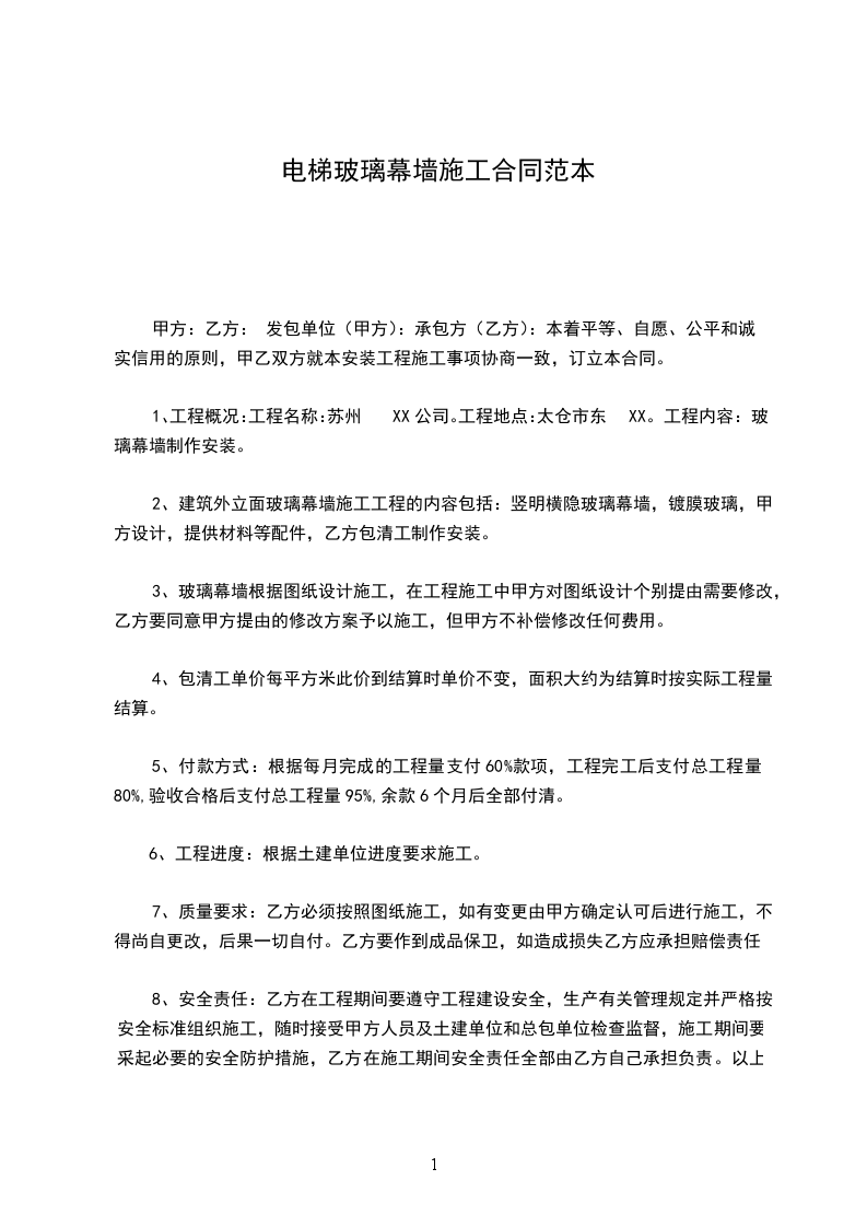 1、工程概况:工程名称:苏州XX公司。工程地点:太仓市东XX。工程内容:玻璃幕墙制作安装。