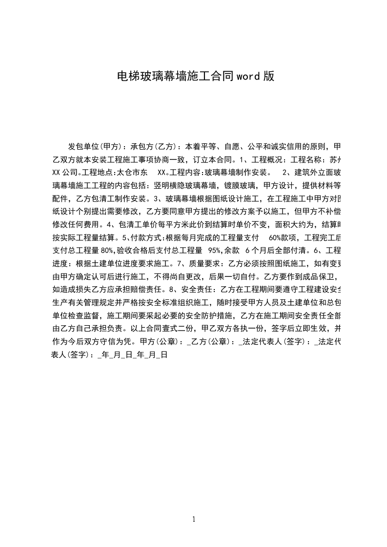 8、安全责任:乙方在工程期间要遵守工程建设安全,生产有关管理规定并严格按安全标准组织施工,随时接受甲方人员及土建单位和总包单位检查监督,施工期间要采起必要的安全防护措施,乙方在施工期间安全责任全部由乙方自己承担负责。以上合同壹式二份,甲乙双方各执一份,签字后立即生效,并作为今后双方守信为凭。甲方(公章):乙方(公章):法定代表人(签字):法定代表人(签字):年月日年月日/