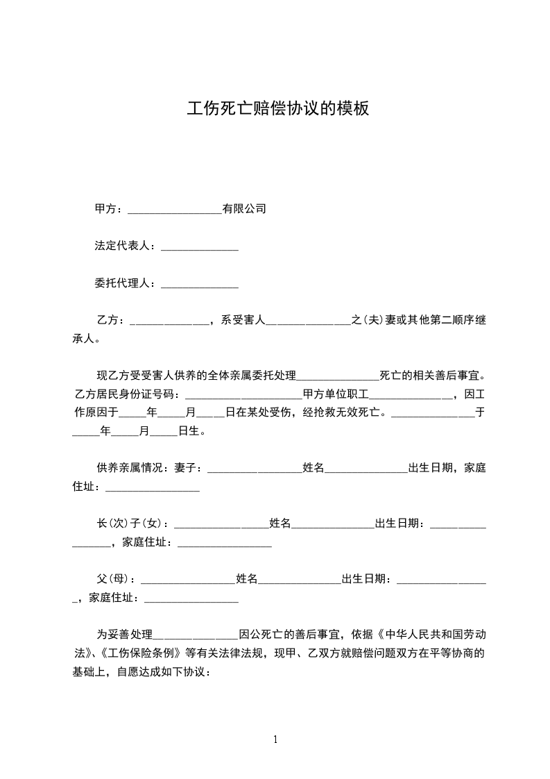 为妥善处理_______________因公死亡的善后事宜,依据《中华人民共和国劳动法》、《工伤保险条例》等有关法律法规,现甲、乙双方就赔偿问题双方在平等协商的基础上,自愿达成如下协议: