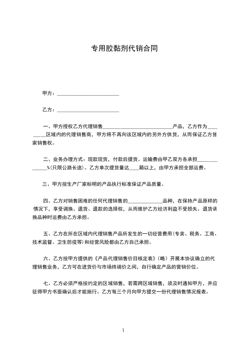 一、甲方授权乙方代理销售____________________________产品,乙方作为_________区域内的代理销售商,甲方将不再向该区域内的另外方供货,从而保证乙方独家销售权。