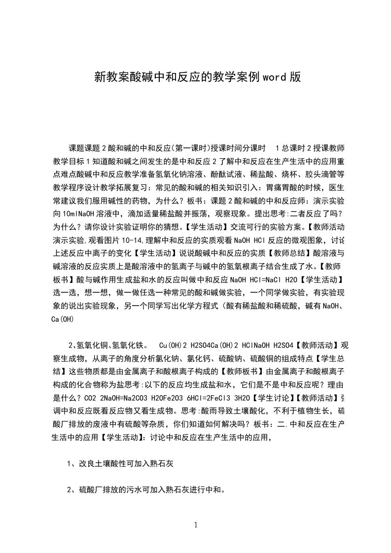 2、石灰水;盐酸、稀硫酸。小组进行实验探究设计,要求分别选择两组不同的酸和碱组合进行定性滴加反应。实施探究过程讨论NaOH溶液和盐酸,以及石灰水和稀H2SO4反应无任何现象,则对结论的判断,可能存在两种观点:1,两者没有发生反应。2,二者发生反应,但没有现象。探究实验二提问如何证明氢氧化钠和稀盐酸发生了反应?引导利用酚酞试剂来判断反应是否进行。酸碱指示剂遇酸碱会显示不同的颜色,提供药品:NaOH溶液、稀盐酸、无色酚酞、紫色石蕊。最终选择方案一,方案二最终紫色显色不明显。视频播放实验视频并分析。小结证明了酸和碱没有反应现象也可以发生反应。探究实验三盐酸与氢氧化钠反应,生成了什么?取上述实验所得的少量溶液于蒸发皿中,加热至蒸干,观察到什么现象?这说明了什么?小结既不是NaOH也不是HCl,那么必然有一种新的物质生成。视频播放盐酸和氢氧化钠反应实质的微观动态图练习写出氢氧化钠和盐酸反应的化学方程式。归纳请同学们观察几个化学方程式的反应物与生成物之间有什么共同点?练习斯XX为什么可以治胃酸?练习了解胃酸成分是盐酸,斯XX主要成分是Al(OH)3学生提出通过实验探究。小组经过讨论得到以下设计,