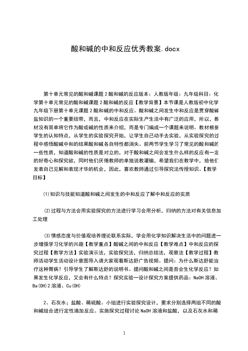 第十单元常见的酸和碱课题2酸和碱的反应版本:人教版年级:九年级科目:化学第十单元常见的酸和碱课题2酸和碱的反应【教学背景】本节课是人教版初中化学九年级下册第十单元课题2酸和碱的中和反应。酸和碱之间发生中和反应是贯穿酸碱盐知识的一个重要纽带,而且,中和反应在实际生产生活中有广泛的应用,所以,教材没有简单将它作为酸或碱的性质来介绍,而是专门编成一个课题来说明。教材根据学生的认知特点,从学生的实验探究开始,让学生自己动手去实验,从实验探究的过程中感悟酸碱中和的结果酸和碱各自特性都消失。前两节学生学习了常见的酸和碱的一些性质,知道酸和碱的性质是对立的,对于酸和碱之间会发生什么样的反应有一定的好奇心和探究欲,同时他们厌倦教师的单独说教灌输,希望我们在教学中,给他们发表自己见解和表现才华的机会,因此,喜欢教师通过引导探究法传授知识。【教学目标】