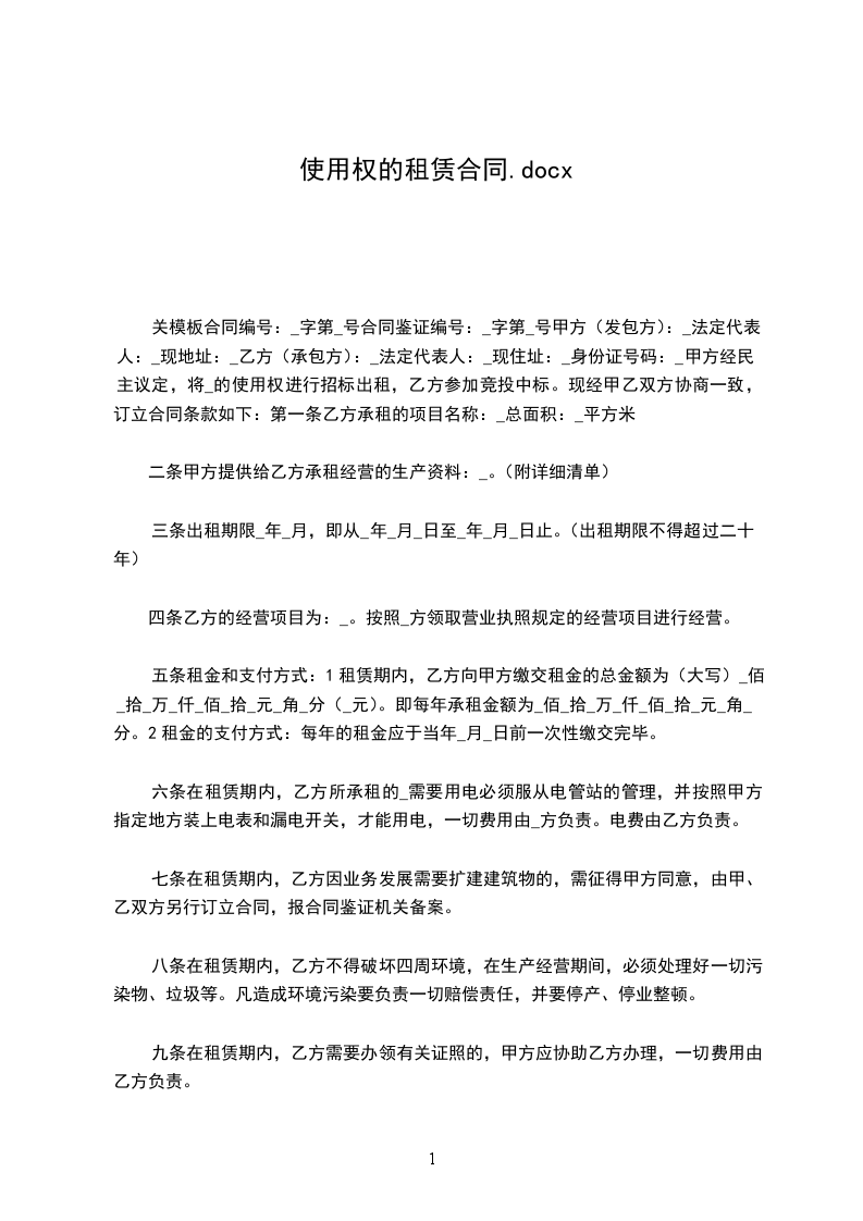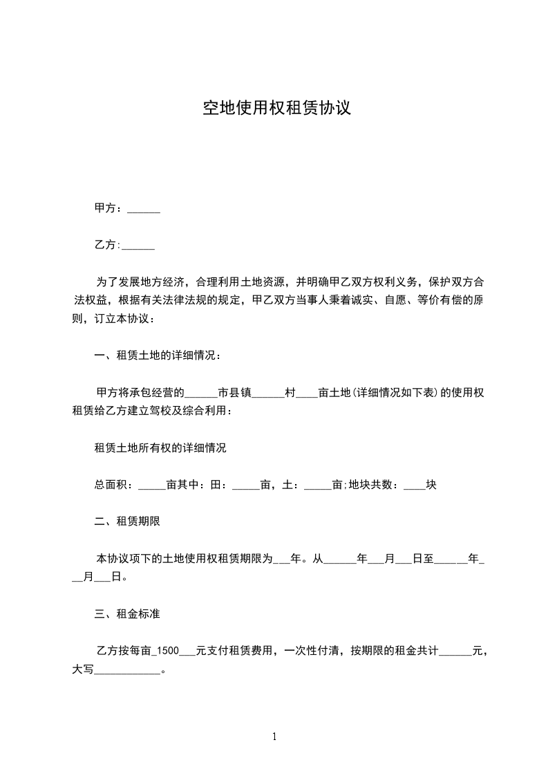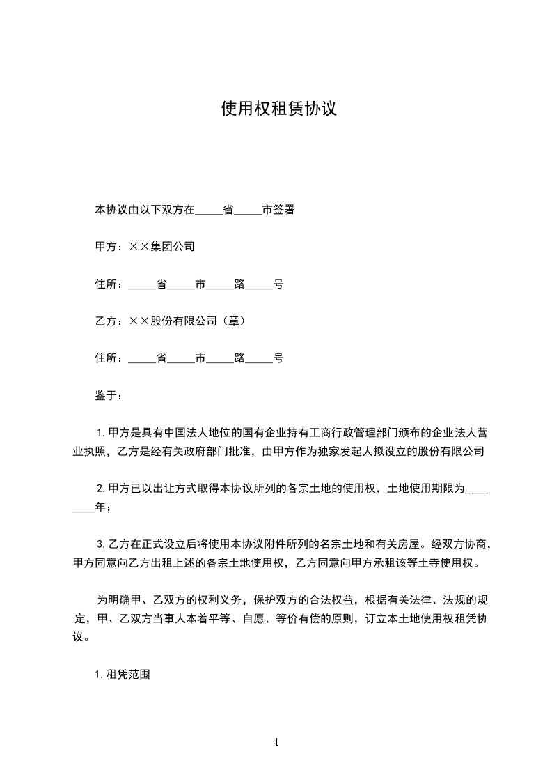 1.1甲方向乙方出租的土地共_____宗,总面积为_____平方米。甲方租给乙方的土地的使用证号、宗地位置、宗地面积、批准用途等内容以附件表格形式列出(详见本协议附件)