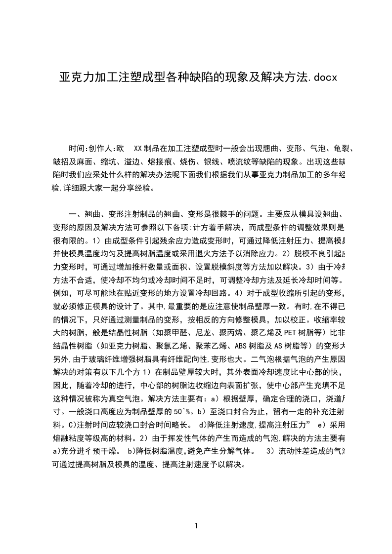 时间:创作人:欧XX制品在加工注塑成型时一般会出现翘曲、变形、气泡、龟裂、皱招及麻面、缩坑、溢边、熔接痕、烧伤、银线、喷流纹等缺陷的现象。出现这些缺陷时我们应采处什么样的解决办法呢下面我们根据我们从事亚克力制品加工的多年经验,详细跟大家一起分享经验。