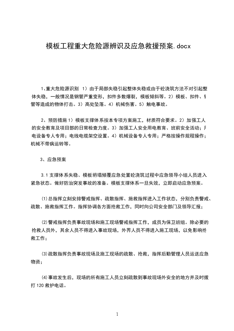 1、重大危险源识别1)由于局部失稳引起整体失稳或由于砼浇筑方法不对引起整体失稳,一般情况是钢管严重变形,扣件多数爆裂,模板倾斜等。2)模板、扣件、钢管等造成的物体打击。3)高处坠落。4)机械伤害。5)触电事故。