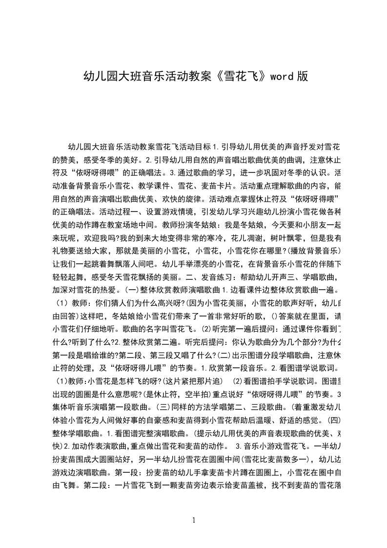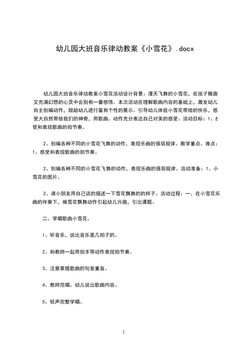 幼儿园大班音乐律动教案小雪花活动设计背景:漫天飞舞的小雪花,在孩子稚趣又充满幻想的心灵中会别有一番感悟。本次活动在理解歌曲内容的基础上,激发幼儿自主创编动作,鼓励幼儿进行富有个性的展示。引导幼儿体验小雪花带给的快乐,感受大自然带给我们的神奇,用歌曲、动作充分表达自己对美的感受。活动目标:1、感受和表现歌曲的拍节奏。