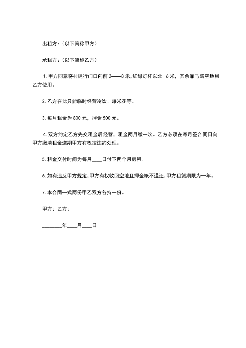 1.甲方同意将村建行门口向前2——8米,红绿灯杆以北6米,其余靠马路空地租乙方使用。