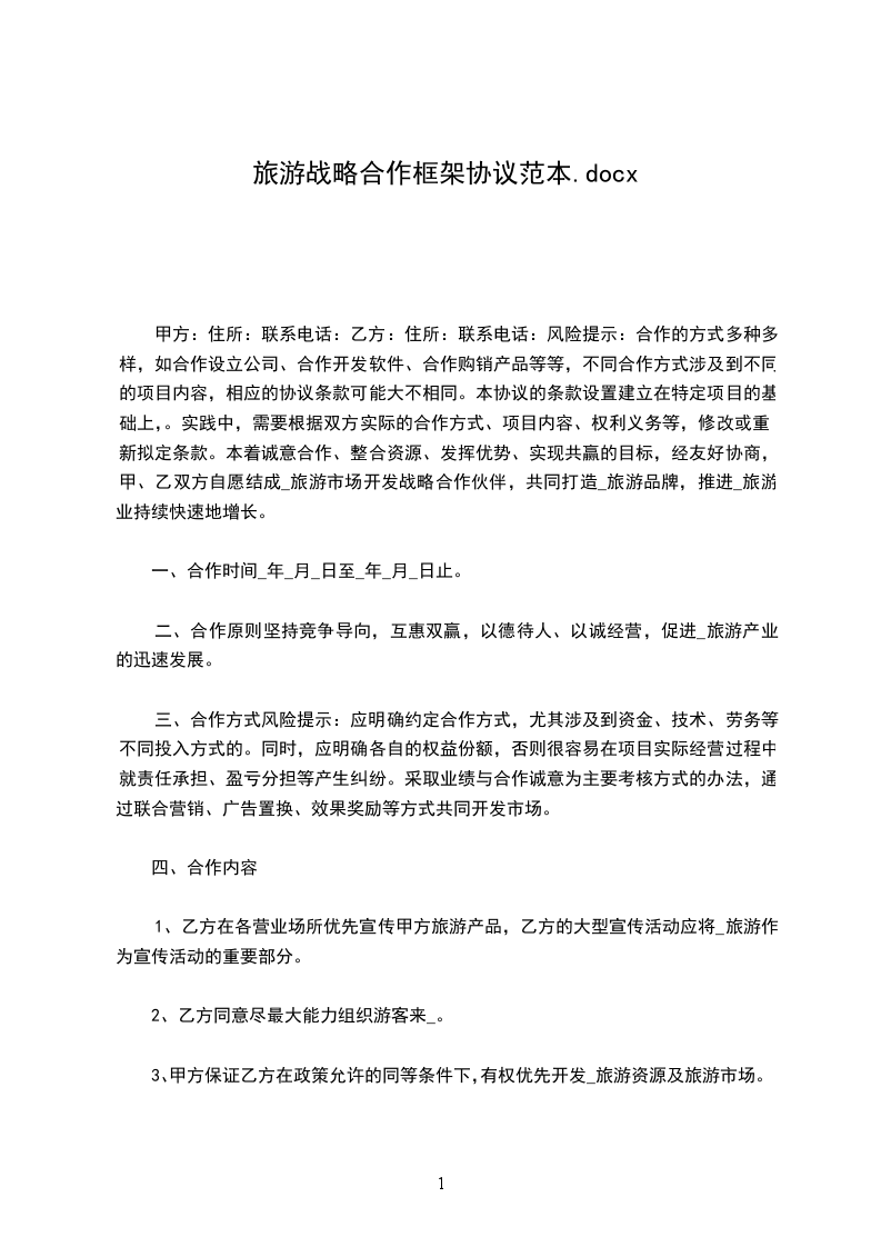 甲方:住所:联系电话:乙方:住所:联系电话:风险提示:合作的方式多种多样,如合作设立公司、合作开发软件、合作购销产品等等,不同合作方式涉及到不同的项目内容,相应的协议条款可能大不相同。本协议的条款设置建立在特定项目的基础上,。实践中,需要根据双方实际的合作方式、项目内容、权利义务等,修改或重新拟定条款。本着诚意合作、整合资源、发挥优势、实现共赢的目标,经友好协商,甲、乙双方自愿结成_旅游市场开发战略合作伙伴,共同打造_旅游品牌,推进_旅游业持续快速地增长。