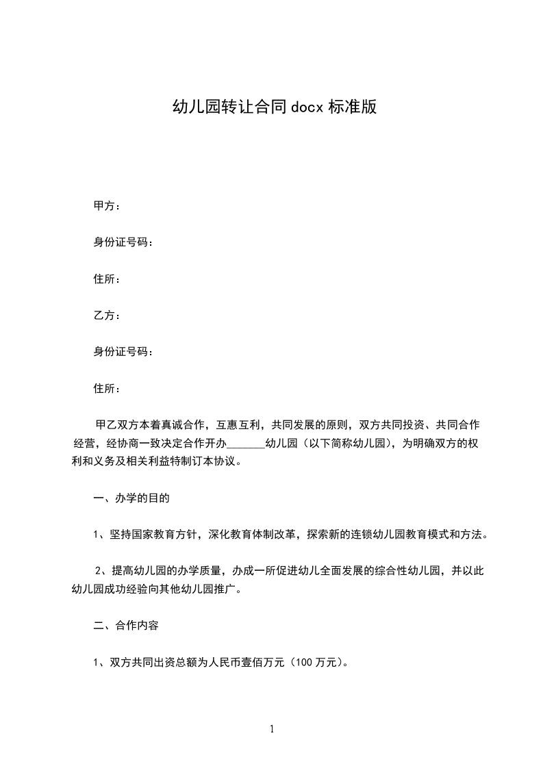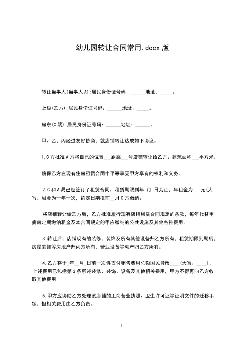 甲方:乙方:签订日期:年月日一转让方(甲方):身份证号:受让方(乙方):身份证号:房东(丙方):身份证号:甲、乙、丙三方经友好协商,就幼儿园转让事宜达成以下协议:第一条: