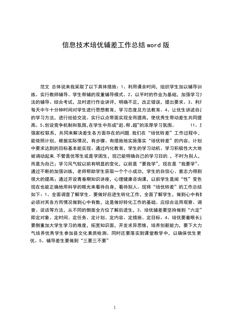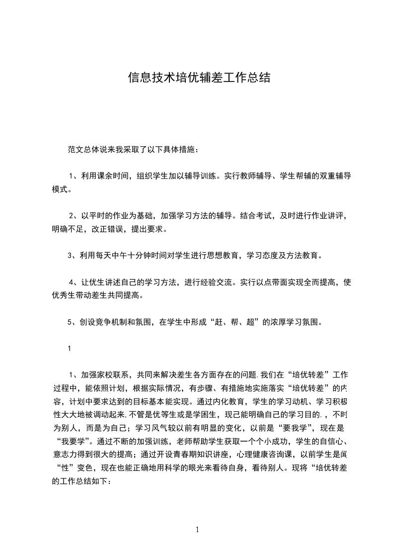 1、加强家校联系,共同来解决差生各方面存在的问题.我们在“培优转差”工作过程中,能依照计划,根据实际情况,有步骤、有措施地实施落实“培优转差”的内容,计划中要求达到的目标基本能实现。通过内化教育,学生的学习动机、学习积极性大大地被调动起来,不管是优等生或是学困生,现己能明确自己的学习目的.,不时为别人,而是为自己;学习风气较以前有明显的变化,以前是“要我学”,现在是“我要学”。通过不断的加强训练,老师帮助学生获取一个个小成功,学生的自信心、意志力得到很大的提高;通过开设青春期知识讲座,心理健康咨询课,以前学生是闻“性”变色,现在也能正确地用科学的眼光来看待自身,看待别人。现将“培优转差”的工作总结如下: