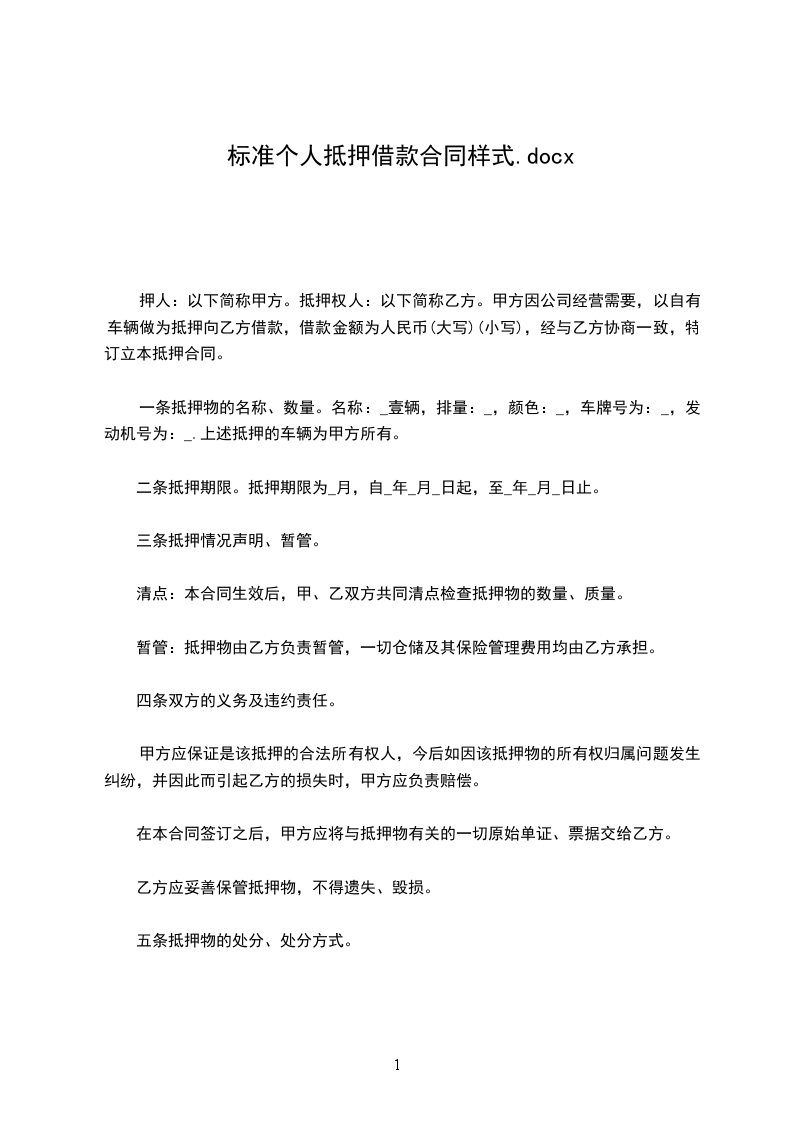 一条抵押物的名称、数量。名称:_壹辆,排量:_,颜色:_,车牌号为:_,发动机号为:_.上述抵押的车辆为甲方所有。