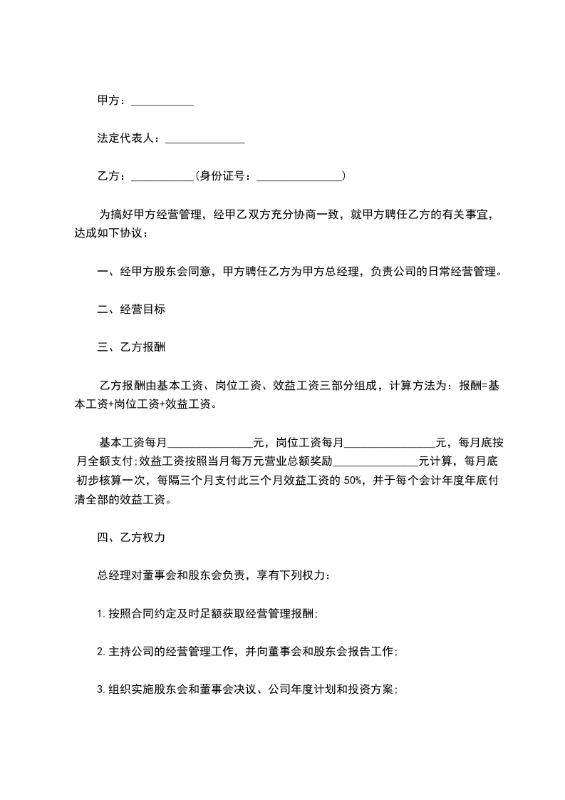 一、经甲方股东会同意,甲方聘任乙方为甲方总经理,负责公司的日常经营管理。
