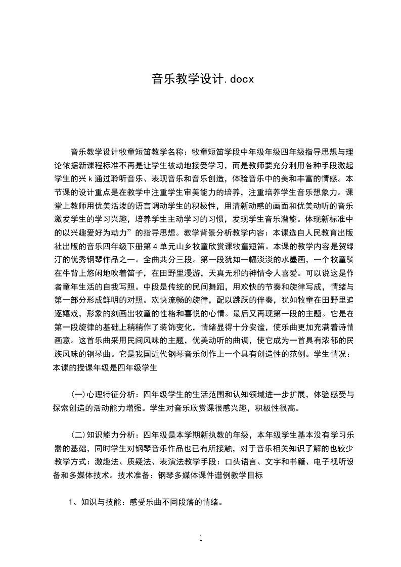 音乐教学设计牧童短笛教学名称:牧童短笛学段中年级年级四年级指导思想与理论依据新课程标准不再是让学生被动地接受学习,而是教师要充分利用各种手段激起学生的兴k通过聆听音乐、表现音乐和音乐创造,体验音乐中的美和丰富的情感。本节课的设计重点是在教学中注重学生审美能力的培养,注重培养学生音乐想象力。课堂上教师用优美活泼的语言调动学生的积极性,用清新动感的画面和优美动听的音乐激发学生的学习兴趣,培养学生主动学习的习惯,发现学生音乐潜能。体现新标准中的以兴趣爱好为动力”的指导思想。教学背景分析教学内容:本课选自人民教育出版社出版的音乐四年级下册第4单元山乡牧童欣赏课牧童短笛。本课的教学内容是贺绿汀的优秀钢琴作品之一。全曲共分三段。第一段犹如一幅淡淡的水墨画,一个牧童骑在牛背上悠闲地吹着笛子,在田野里漫游,天真无邪的神情令人喜爱。可以说这是作者童年生活的自我写照。中段是传统的民间舞蹈,用欢快的节奏和旋律写成,情绪与第一部分形成鲜明的对照。欢快流畅的旋律,配以跳跃的伴奏,犹如牧童在田野里追逐嬉戏,形象的刻画出牧童的性格和喜悦的心情。最后又再现第一段的主题。它是在第一段旋律的基础上稍稍作了装饰变化,情绪显得十分安谧,使乐曲更加充满着诗情画意。这首乐曲采用民间风味的主题,优美动听的曲调,使它成为一首具有浓郁的民族风味的钢琴曲。它是我国近代钢琴音乐创作上一个具有创造性的范例。学生情况:本课的授课年级是四年级学生