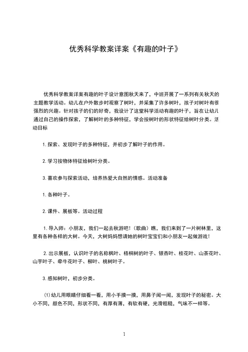 优秀科学教案详案有趣的叶子设计意图秋天来了,中班开展了一系列有关秋天的主题教学活动。幼儿在户外散步时观察了树叶,并采集了许多树叶,孩子对树叶有很强烈的兴趣。针对孩子的们的好奇,我设计了这堂科学活动有趣的叶子,旨在让幼儿通过自己的操作探索,了解树叶的多种特征,学会按树叶的形状特征给树叶分类。活动目标