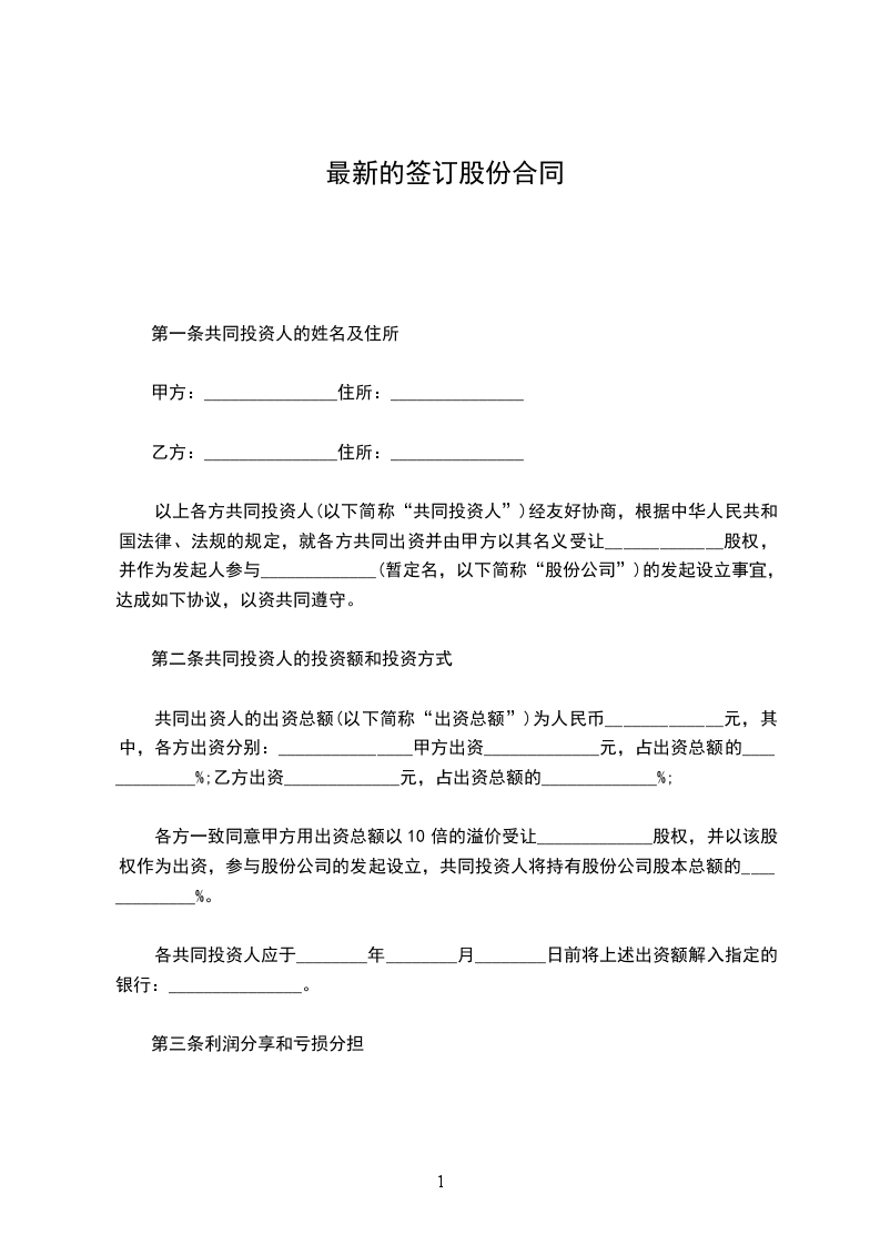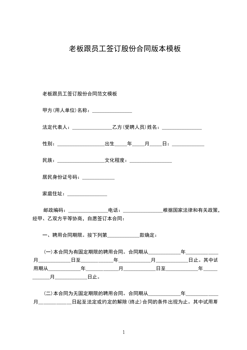 老板跟员工签订股份合同最新范文