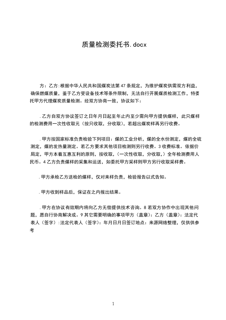 方:乙方:根据中华人民共和国煤炭法第47条规定,为维护煤炭供需双方利益,确保燃煤质量,鉴于乙方受设备技术等条件限制,无法自行开展煤质检测工作,特委托甲方代理煤炭质量检测。经双方协商一致,协议如下: