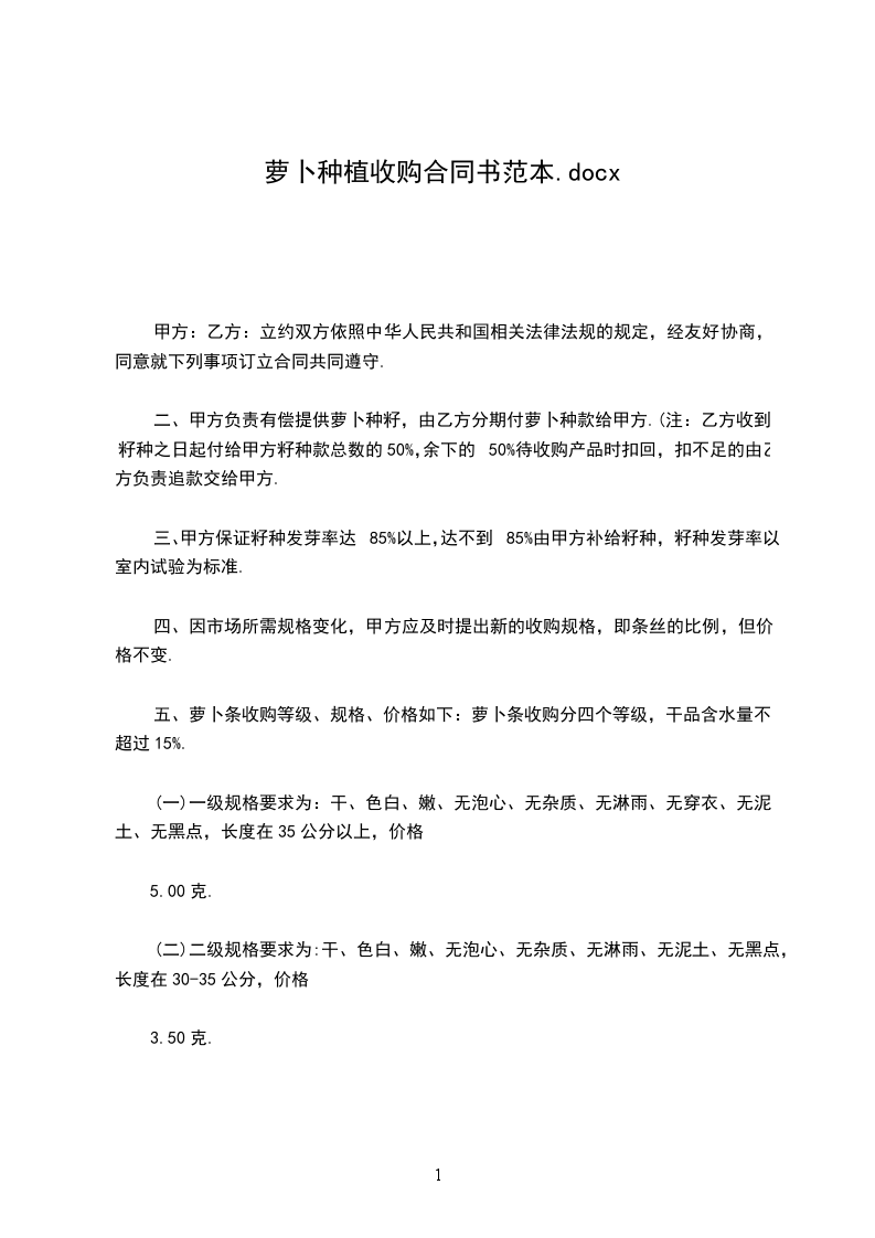 二、甲方负责有偿提供萝卜种籽,由乙方分期付萝卜种款给甲方.(注:乙方收到籽种之日起付给甲方籽种款总数的50%,余下的50%待收购产品时扣回,扣不足的由乙方负责追款交给甲方.