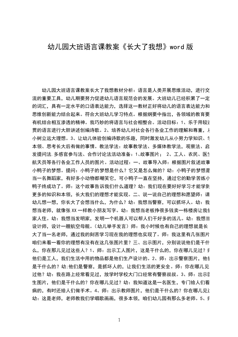 语言课教案长大了我想教材分析:语言是人类开展思维活动,进行交流的重要工具,幼儿期要努力促进幼儿语言规范会的发展。大班幼儿已经积累了一定的词汇,具有一定水平的口语表达能力,选择这一教材正好将幼儿的语言表达能力和思维创新能力结合起来。符合大班幼儿学习特点。根据纲要中指出,各领域的教育要有机结合相互渗透的精神。我巧妙的将语言与社会相整合。活动目标: