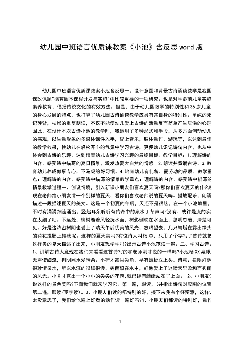 出现了古诗教学活动,为了上好古诗教学,同时结合季节特点,我选择了古诗小池,活动中我通过课件的图画,让幼儿初步感受小池景色的秀丽,古诗的意境美并让幼儿用自己的话描述自己看到的景色,在幼儿充分用自己的语言表达着图画的意思时,教师话锋一转:古时候有个诗人叫杨XX,也和你们一样觉得这景色很美,沉醉在这初夏的美景中,于是写下了千古流传的经典古诗小池,你们想不想听听诗人是怎么用诗句来描写这幅画面的呢此时激发了幼儿的想听古诗兴趣,毕竟诗人会怎样用古诗来描写这样的画面呢和我们说的会有什么不同呢于是在教师奇妙设计的情景中,孩子们带着这样的想法,进入了古诗教学活动中。在理解古诗内容的时候,教师紧紧抓住诗中描写的景物:泉眼、树阴、小荷、蜻蜓,来引出相应的诗句进行学习和诵读,并让幼儿通过图文结合感受泉眼与泉水、树阴与池水、小荷与蜻蜓之间的联系,从而感受自然之间的和谐与美好。为让幼儿更好的感受古诗的意境美,对诗句中关键词做了一定得理解。理解的时候利用了幼儿在平常“词语开花”的经验,对古诗中关键的词语进行拆字组词的方法,这样幼儿不仅很感兴趣,也很简单的理解了字词的意思。在进行教学中,我也看到教学中的不足之处:假如在孩子们自由叙述了画面的内容后,教师能准时把幼儿的发言进行归纳,用散文的形式对画面总结性描述,对于幼儿感受古诗的意境美会起到很大的帮助。古代诗词是中国传统文化的瑰丽结晶,它具有句子简短,语言简练,意境美丽等特点,在进行古诗文教学时,增加幼儿对中国传统文化的了解和熟悉,加强幼儿对语言的鉴赏能力和对美的感受能力,这对于培育幼儿良好的文化修养具有剧烈的熏陶作用。教师的语言应当更锤炼,做到语言简练。这次教学活动,教师是通过让幼儿找出关键事物,并让幼儿找一找这些景物分别都藏在哪些诗句里,来引出诗句,然后通过图文对照的方法理解古诗,感受意境。假如换一种方式,在幼儿找出古诗中描写的景物以后,立刻回到画面中,通过画面的理解再引出古诗进行学习,哪一种方式更有效。