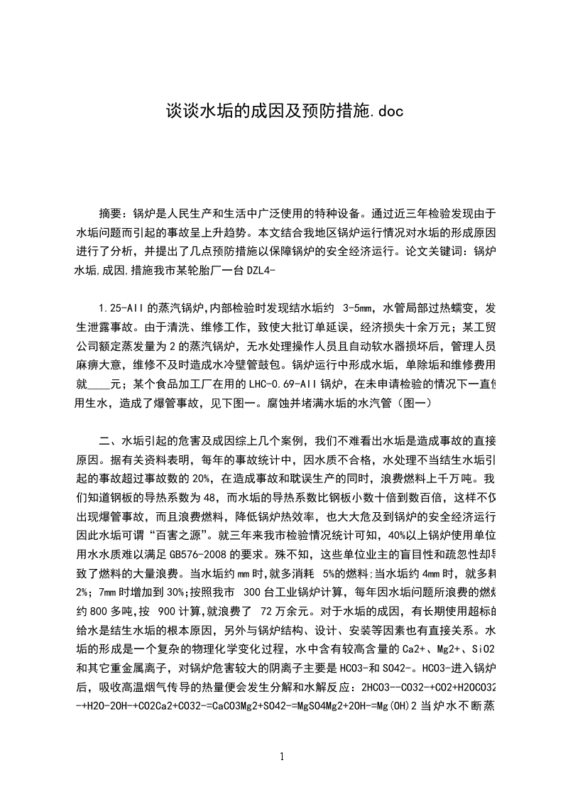 摘要:锅炉是人民生产和生活中广泛使用的特种设备。通过近三年检验发现由于水垢问题而引起的事故呈上升趋势。本文结合我地区锅炉运行情况对水垢的形成原因进行了分析,并提出了几点预防措施以保障锅炉的安全经济运行。论文关键词:锅炉,水垢,成因,措施我市某轮胎厂一台DZL4-