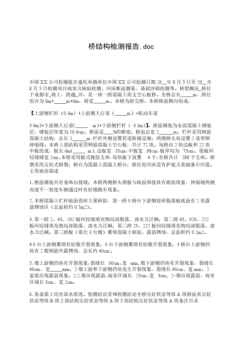 3、设备明细表作为本协议的附件。协议双方:乙方(盖章):甲方(盖章):代表人(签字):代表人(签字):签署日期:年月日签署日期:年月日甲方:乙方:签署日期:_年月设备清单购买时价格名称规格型号数量单位生产厂家运行情况(单位:元)桥桥梁检测专业HHR5250JQJ6湖南XX公司辆正常车轻型货车长城CC03PS45辆正常装卸车2T台正常液压同步顶升系SGLS-6P3上海XX公司套正常统千斤顶000mm36台正常000mm30正常0040mm28正常0000mm24正常混凝土钢筋检测HC-GY30台正常仪数显回弹仪HT-225W2台正常裂缝侧宽仪HC-CK022台正常钢筋质量检测仪SW-80S台正常发电机+配电箱30KW组正常汽油发电机