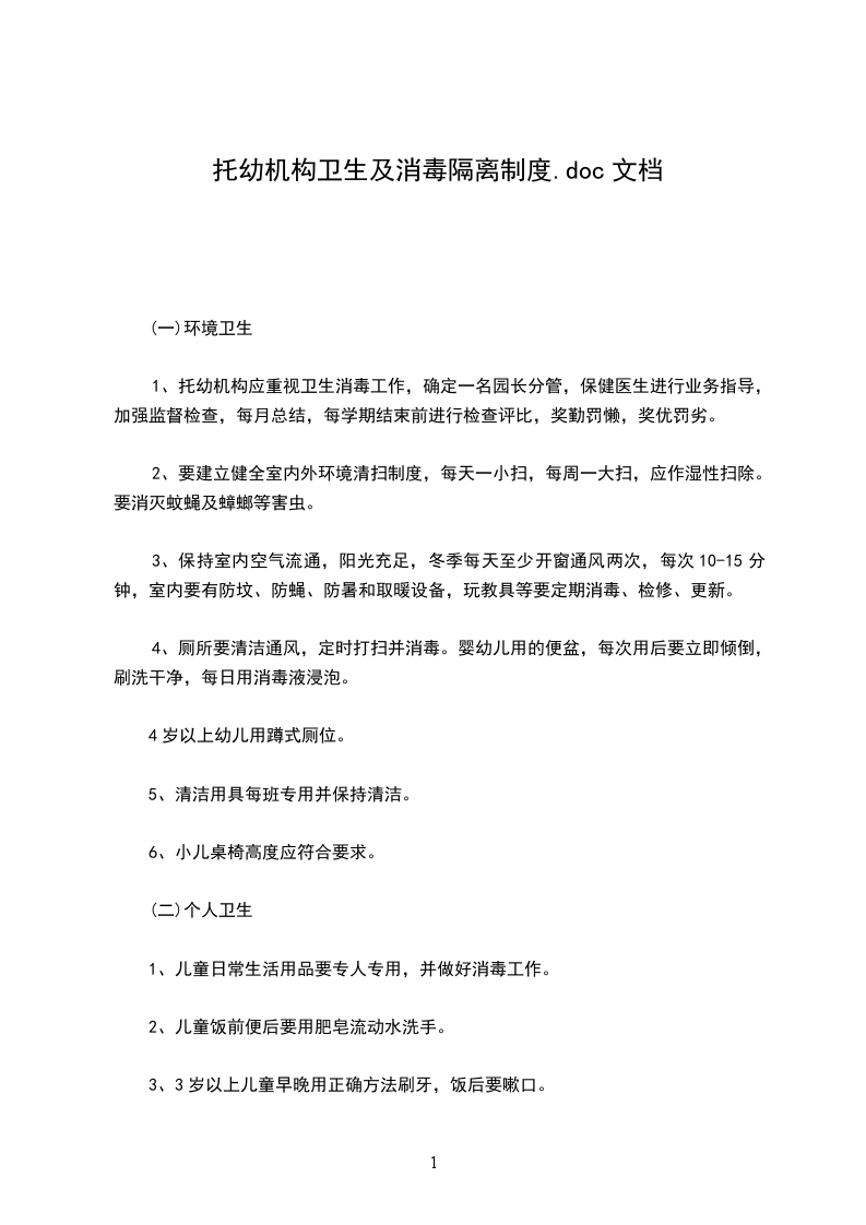 1、预防性消毒培养儿童良好的卫生习惯,养成饭前便后洗手,勤剪指甲等个人卫生和公共卫生习惯。食堂卫生应贯彻中华人民共和国食品卫生法,严格执行“五四”制。厨房用具要经常清洗,每天消毒一次,食具、餐巾等一餐一消毒。环境卫生要制度化。采取专人常年打扫和集体定期打扫相结合的办法。每周一小扫,每月一大扫。划区定片,责任到人,定期评比,限期整改。室内卫生每日一小扫,每周一大扫。做到窗明桌净,无蚊蝇鼠害;勤打窗换气,保持室内空气清新。室内空气消毒,至少一周次。与保教人员、儿童经常接触的物体表现要重点清洁消毒,如毛巾、茶壶(桶)、水龙头、保健牌、口杯、杯架、玩教具、桌椅、门把手等,每天消毒一次。室内地面每天拖洗-2次,被褥应经常曝晒,每周次,经常保持地面清洁。床单、被套每半月换洗次。便器使用后要立即倾倒冲洗,然后浸泡在消毒液中,小时后再用。放便器的架子每天用消毒水消毒-2次。大小便池(槽)要随用随清洗,每天早晚用消毒水彻底洗刷一次,做到无污物、无臭味。