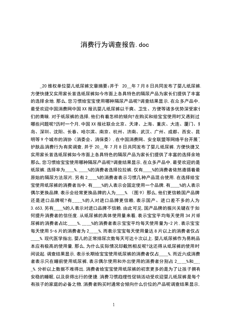 _20维权单位婴儿纸尿裤文章摘要:并于20__年7月8日共同发布了婴儿纸尿裤.方便快捷又实用家长首选纸尿裤如今市面上各具特色的隔尿产品为家长们提供了丰富的选择余地.那么,您习惯给宝宝使用哪种隔尿产品呢?调查结果显示,在众多产品中,最受欢迎中国消费网中国XX报讯婴儿纸尿裤以干爽、卫生、方便等诸多优势深受家长们的青睐.对于纸尿裤的选择,他们有着怎样的倾向?在购买和给宝宝使用时又遇到过哪些问题呢?历时一个月,中国XX报社联合北京、天津、上海、重庆、大连、厦门、青岛、深圳、沈阳、长春、哈尔滨、南京、杭州、济南、武汉、广州、成都、西安、昆明等9个城市的消协(消委会、消保委),在中国消费网、安全联盟等网络平台开展了护肤品消费行为有奖调查,并于20__年7月8日共同发布了婴儿纸尿裤.方便快捷又实用家长首选纸尿裤如今市面上各具特色的隔尿产品为家长们提供了丰富的选择余地.那么,您习惯给宝宝使用哪种隔尿产品呢?调查结果显示,在众多产品中,最受欢迎的是纸尿裤,选择率为____%,____%的消费者选择拉拉裤,仅有____%的消费者依然遵循着最原始的隔尿方法尿片,另有2____%的消费者表示习惯几种产品混合使用.在选择给宝宝使用纸尿裤的消费者当中,有____%的人表示会固定使用一个品牌,有____%的人表示偶尔更换品牌,表示会经常更换品牌的人为____%.(图9)那么,他们更信赖国产品牌还是进口品牌呢?有____%的人对进口品牌更信赖,表示国产、进口差不多的人为3.653,另有____%的人表示对进口品牌不信赖.由此可见,国产品牌的振兴关键在于如何提升消费者的信任度.从纸尿裤的具体使用量来看,表示宝宝平均每天使用34片纸尿裤的消费者占比____%,____%的消费者表示宝宝平均每天使用量为-2片,表示宝宝每天使用5-6片的消费者为2____%,而表示宝宝每天使用量达8片以上的消费者仅占____%.现代医学指出,婴儿的正常排尿次数每天可达十次以上.婴儿纸尿裤作为易耗品,本应有极高的使用量,那么,为什么实际情况却截然相反呢?这还得从纸尿裤的使用时间说起.调查结果显示,表示长期给宝宝使用纸尿裤的消费者仅占____%,而近六成消费者表示只在睡前使用纸尿裤,表示偶尔使用和外出使用的消费者分别占2____%和____%.分析以上数据不难得出,消费者给宝宝使用纸尿裤的初衷更多的是为了让孩子拥有安稳的睡眠,以及获得出行的便捷.消费习惯趋理性促销活动受欢迎婴儿纸尿裤是每个有孩子的家庭的必备之物,消费者购买时通常会倾向什么价位的产品呢调查结果显示,有____%的消费者倾向于购买价格在每片____元之间的产品,____%的消费者倾向于价格区间为每片____元的产品,倾向于每片价格