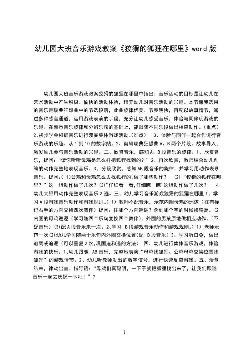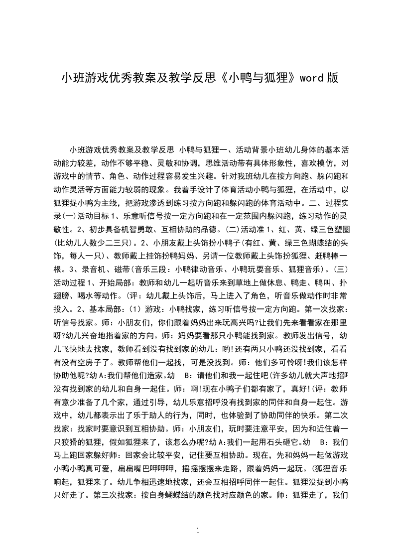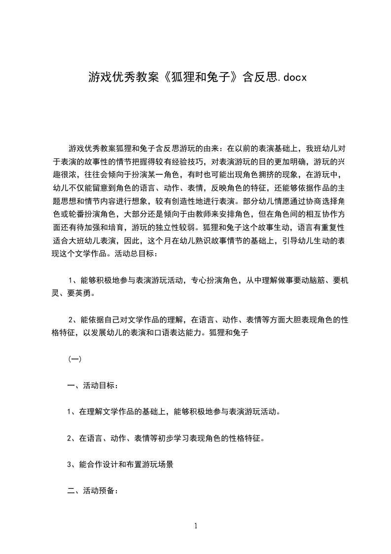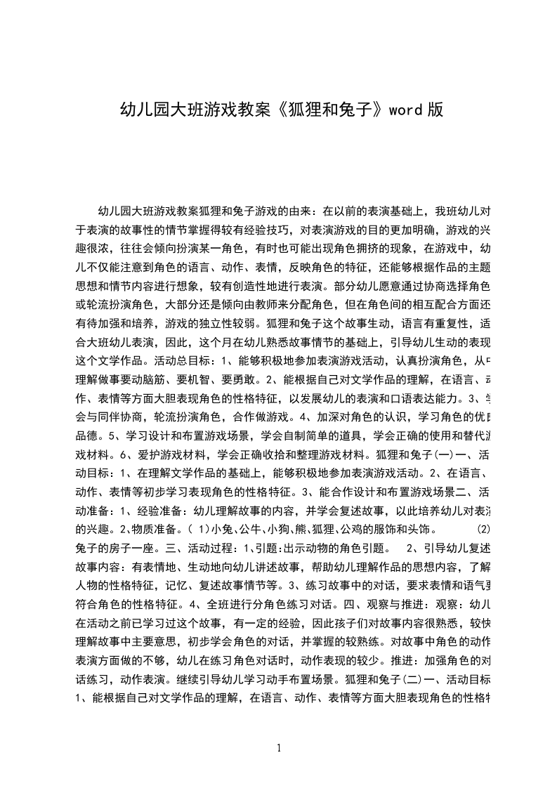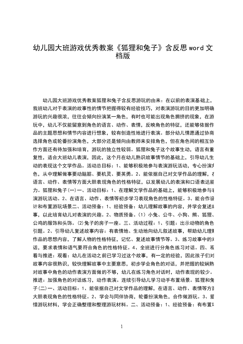 游戏优秀教案狐狸和兔子含反思游玩的由来:在以前的表演基础上,我班幼儿对于表演的故事性的情节把握得较有经验技巧,对表演游玩的目的更加明确,游玩的兴趣很浓,往往会倾向于扮演某一角色,有时也可能出现角色拥挤的现象,在游玩中,幼儿不仅能留意到角色的语言、动作、表情,反映角色的特征,还能够依据作品的主题思想和情节内容进行想象,较有创造性地进行表演。部分幼儿情愿通过协商选择角色或轮番扮演角色,大部分还是倾向于由教师来安排角色,但在角色间的相互协作方面还有待加强和培育,游玩的独立性较弱。狐狸和兔子这个故事生动,语言有重复性,适合大班幼儿表演,因此,这个月在幼儿熟识故事情节的基础上,引导幼儿生动的表现这个文学作品。活动总目标: