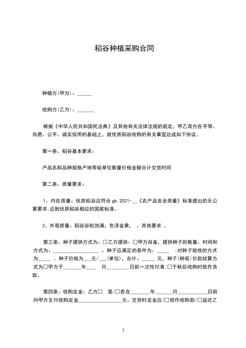 五、争议解决方式如杲甲、乙双方在购销过程中有争议,双方可协商解决,如协商解决不了,可由仲裁机关镇赍县人民法院依法仲裁解决。此合同一式两份,签订、交付定金之日生效。甲方:乙方:年月日篇二:稻谷购销合同书稻谷购销合同书购方:(简称甲方)销方:(简称乙方)甲方因需向乙方购进早釉稻谷公斤,为明确双方责任,签订有关条款如下: