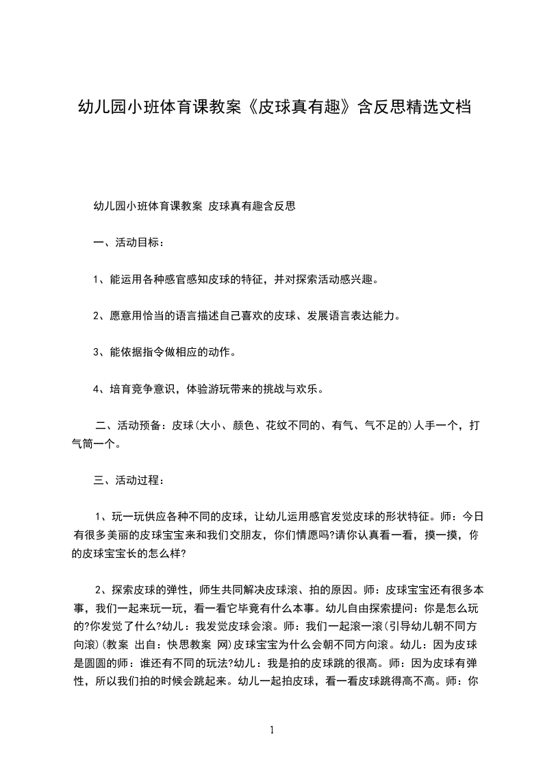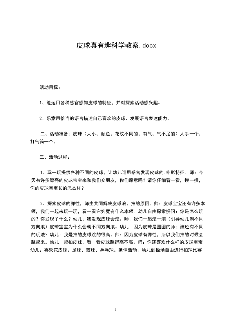 2、探索皮球的弹性,师生共同解决皮球滚、拍的原因。师:皮球宝宝还有许多本领,我们一起来玩一玩,看一看它究竟有什么本领。幼儿自由探索提问:你是怎么玩的?你发现了什么?幼儿:我发现皮球会滚。师:我们一起滚一滚(引导幼儿朝不同方向滚)皮球宝宝为什么会朝不同方向滚。幼儿:因为皮球是圆圆的师:谁还有不同的玩法?幼儿:我是拍的皮球跳的很高。师:因为皮球有弹性,所以我们拍的时候会跳起来。幼儿一起拍皮球,看一看皮球跳得高不高。师:你还喜欢什么样的皮球宝宝?幼儿:喜欢花皮球、足球、篮球、乒乓球。延伸活动:幼儿到操场自由进行拍球比赛。