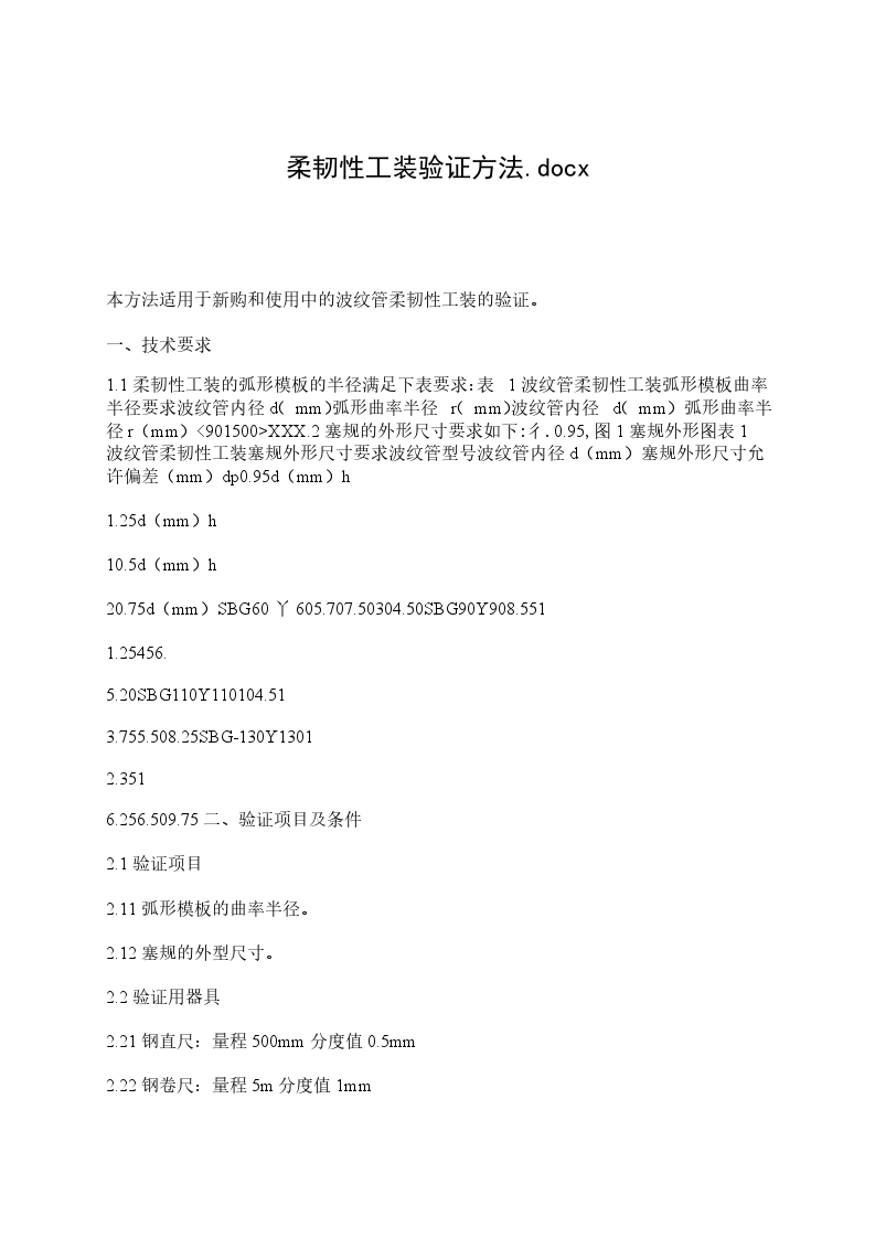 五、验证周期、记录验证周期为12个月。验证记录格式见下表。仪器编号检验号项目检验数据结果弧形模板曲率半径r(mm)规格r读数1读数2读数3读数4平均值1mm1800塞规外形规格项目读数1读数2读数3读数4平均值d(mm)50dphh1h260dPhh1h275dphh1h290dphh1h2100dphh1h2110dphh1h130dphh1h2检验结论:检验员校核员检验日期年月日管理编号:柔韧性工装验证记录编号: