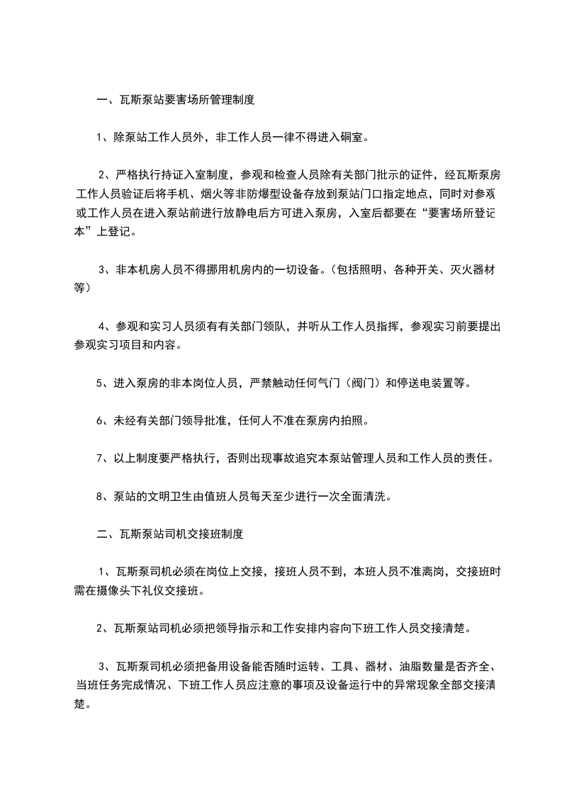 1、瓦斯泵司机必须在岗位上交接,接班人员不到,本班人员不准离岗,交接班时需在摄像头下礼仪交接班。