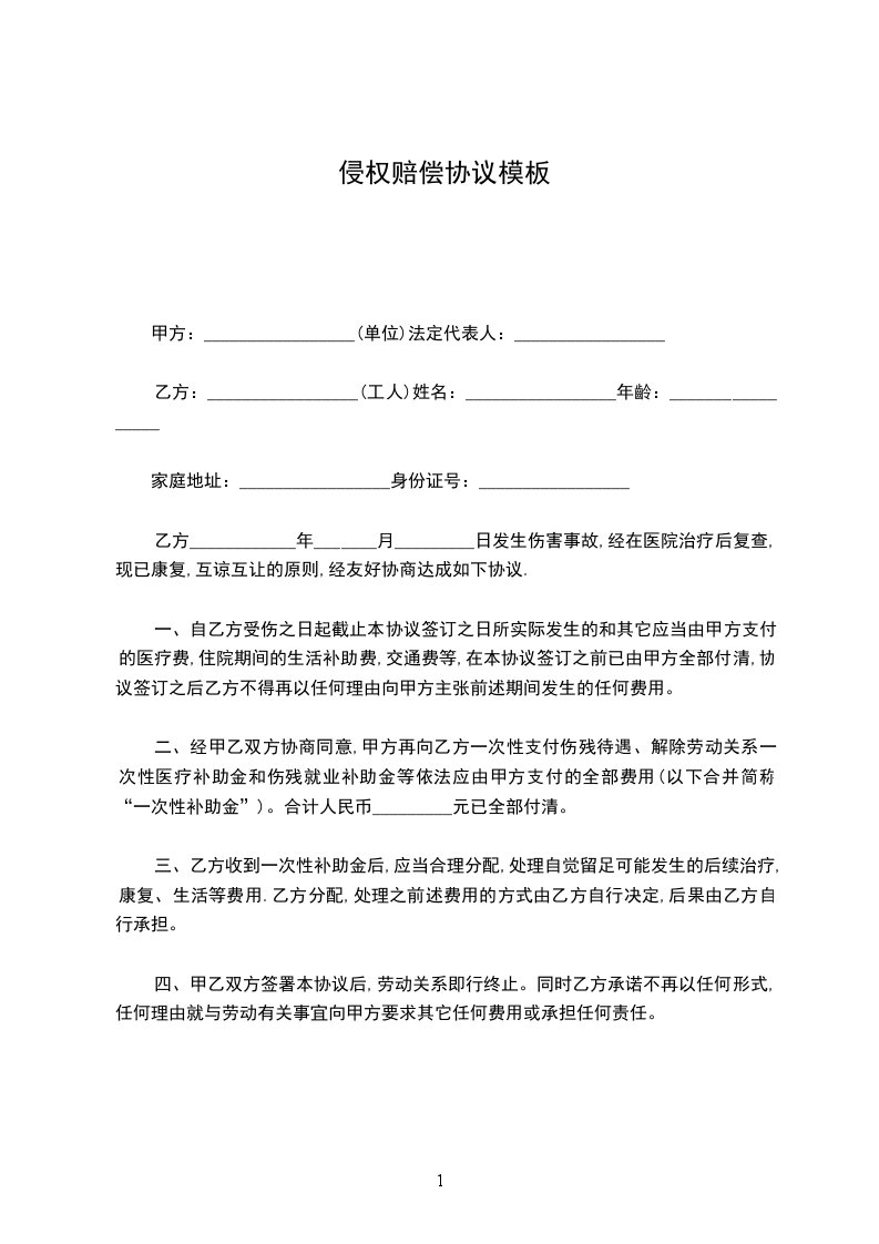 一、自乙方受伤之日起截止本协议签订之日所实际发生的和其它应当由甲方支付的医疗费,住院期间的生活补助费,交通费等,在本协议签订之前已由甲方全部付清,协议签订之后乙方不得再以任何理由向甲方主张前述期间发生的任何费用。