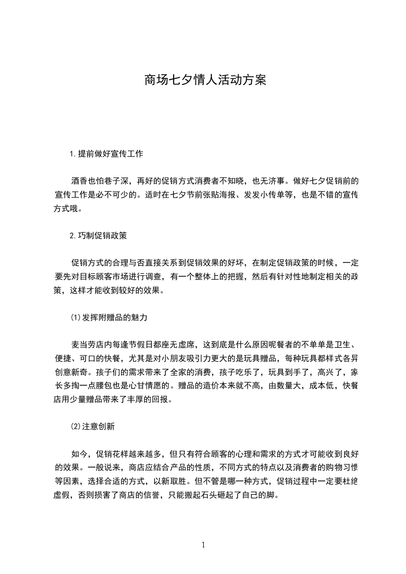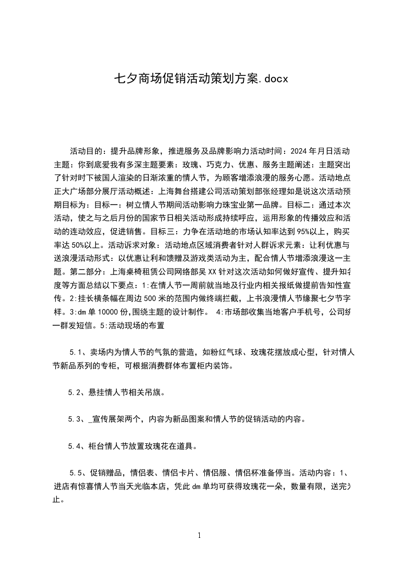 5、26晚间电台节目主持人现场与您欢度浪漫情人夜5红鹦鹉餐厅酒吧热闹营业,LiveBAND悠扬乐声与您尽享欢乐浪漫夜六.浪漫宣言留言板活动时间:5-5活动办法:请将您心中隐藏已久的爱情宣言填写于本留言卡,注明姓名、地址及电话,在活动期间内将截角投入F服务台留言箱内或寄回本公司。我司将汇集精彩的留言于8月25日当天展示在F门前广场,并挑选出最真、最酷宣言得主各3名,在电台特定档节目中播出,并赠送热贴情侣T恤一套、情侣照一组。三一、总体思路七夕是中国传统的情人节,由于国人越来越珍视中国的传统文化、民俗节日,再加上商家每年大张旗鼓的宣传炒作,七夕情人节已经成为情侣必过的节日之一。本促销策划案主要提出两大紧贴“七夕”主题的大型促销活动,以配合店内各商家、场馆促销活动,营造浓郁的情人节消费氛围。另外,由于黄金珠宝是情人节的主力商品之一,建议将商场每年一度面向婚庆市场的“秋季钻饰节”于七夕启动,以“节”促“节”,并借情人节的巨大商机给钻饰节带来一个好的开端。