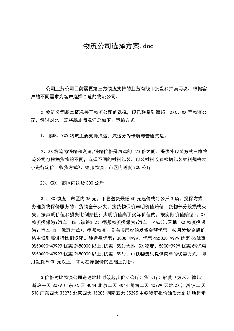 2.物流公司基本情况关于物流公司的选择,现已联系到德邦、XXX、XX等物流公司,经过对比,现将基本情况汇总如下:运输方式