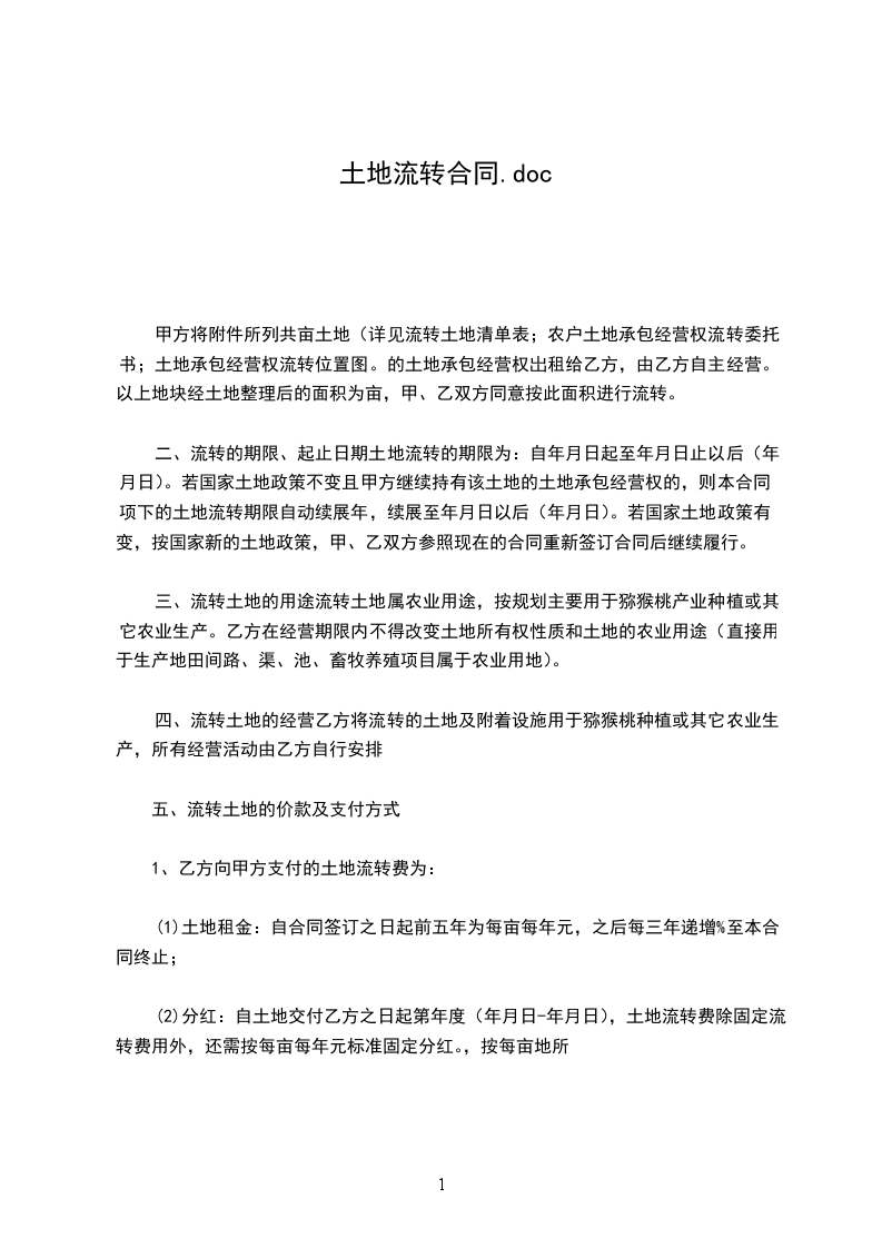 二、流转的期限、起止日期土地流转的期限为:自年月日起至年月日止以后(年月日)。若国家土地政策不变且甲方继续持有该土地的土地承包经营权的,则本合同项下的土地流转期限自动续展年,续展至年月日以后(年月日)。若国家土地政策有变,按国家新的土地政策,甲、乙双方参照现在的合同重新签订合同后继续履行。