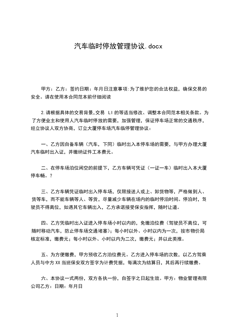 2.请根据具体的交易背景,交易LI的等适当修改、调整本合同范本相关条款。为了方便业主和使用人汽车临时停放的需要,加强管理,保证停车场正常的交通秩序,经立协议人双方协商,订立大厦停车场汽车临停管理协议: