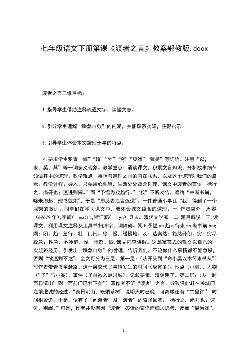 4.要求学生积累“阖”“趋”“牡”“穷”“爽然”“犹是”等词语。注意“以,束,奚,其”等一词多义现象。教学重点:诵读课文,积累文言知识,分析故事细节,领悟其中的道理。教学难点:事情与道理之间的内在联系,以及这个道理对我们的启示。教学过程:导入:只要用心观察,生活处处蕴含哲理。课文中渡者的言语“徐行之,尚开也;速进则阖。”而“予愠为戏趋行。”“我”不听劝告,最终“束断书崩,啼未即起,理书就束”,于是“思渡者之言近道”。一件普通小事让“我”得到了一个深刻的教训。同学们在学习课文中,要体会课文蕴含的道理。一.作者简介:周容(69679年),字鄮(mo)山,浙江鄞(yn)县人。清代文学家。二.题目解说:三.读课文,利用课文注释及工具书扫清字、词障碍。阖h予愠yn趋q行束sh断书崩bng阖:闭。趋:急行。牡:门闩。徐:慢,缓慢地。及:达爽然:豁然开朗。穷:穷尽。躁急:性急,不冷静。愠:恼怒。四.课文内容讲解。这篇寓言式的散文以自己的一次赶路经历,引发出“躁急自败”的哲理,告诉我们,不论做什么事情都不能急躁,否则“欲速则不达”。全文可分为三层。第一层:(从开头到“命小奚以木简束书从”)写作者带着书童赶路。这一层交代了事情发生的时间(庚寅冬)、地点(小港)、人物(“予”与小奚)、事件(予自欲入蛟川城)。记叙要素,清楚明了。第二层:(从“时西日沉山”到“而前门已牡下矣”)写作者不听“渡者”之言,导致没能赶在关城门之前进城的经过。“西日沉山,晚烟萦树”说明天时已晚,可离城还有“二里许”,时间很紧迫。于是,便有了“问渡者”及“渡者”的奇怪回答:“徐行之,尚开也;速进,则阖。”可是,作者并没有因“渡者”答话的奇怪而细加思考,反而“愠为戏”,坚持“趋行”,结果,“小奚仆,束断书崩,啼未即起,理书就束,而前门已牡下矣”。第三层:(从“予爽然”到文末)写作者的感悟“躁急自败”。这一层,作者将自己赶路之事推及到生活中所有类似的事情,揭示出“躁急自败”,欲速则不达的生活哲理。文中连说两遍“其犹是也夫”,是为了强调“躁急自败”的道理,表达了作者极其懊悔、惭愧,感悟至深的心情。五.写法探究
