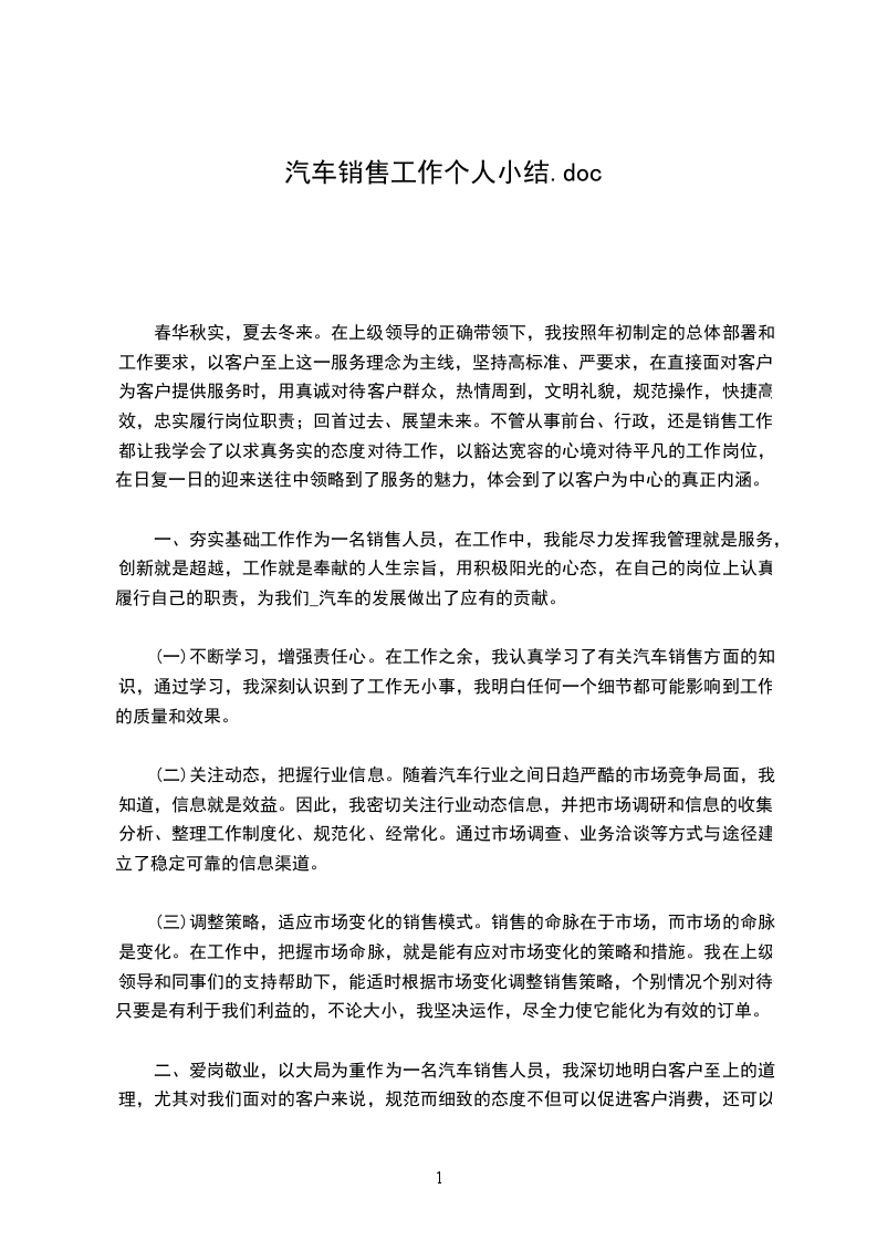 一、夯实基础工作作为一名销售人员,在工作中,我能尽力发挥我管理就是服务,创新就是超越,工作就是奉献的人生宗旨,用积极阳光的心态,在自己的岗位上认真履行自己的职责,为我们_汽车的发展做出了应有的贡献。