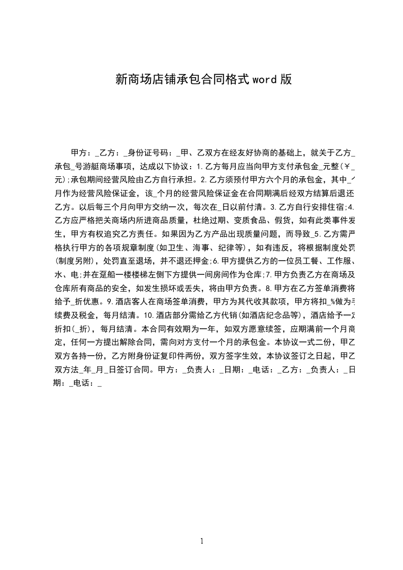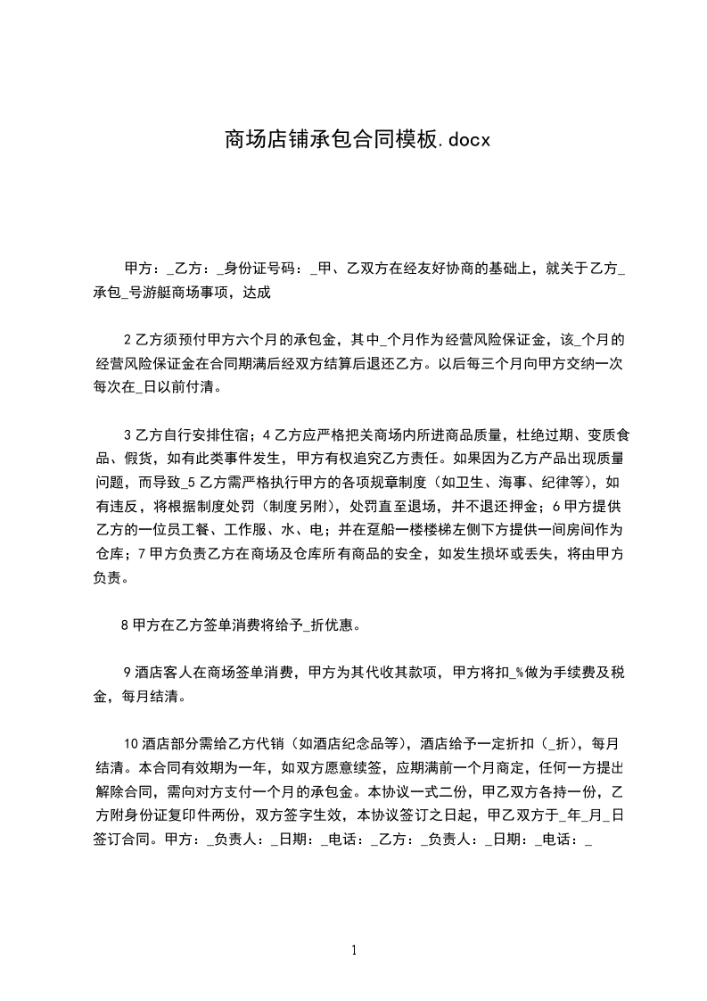 10.酒店部分需给乙方代销(如酒店纪念品等),酒店给予一定折扣(_折),每月结清。本合同有效期为一年,如双方愿意续签,应期满前一个月商定,任何一方提出解除合同,需向对方支付一个月的承包金。本协议一式二份,甲乙双方各持一份,乙方附身份证复印件两份,双方签字生效,本协议签订之日起,甲乙双方于_年_月_日签订合同。甲方:_负责人:_日期:_电话:_乙方:_负责人:_日期:_电话:_
