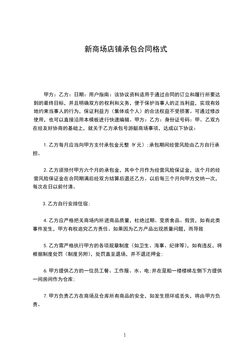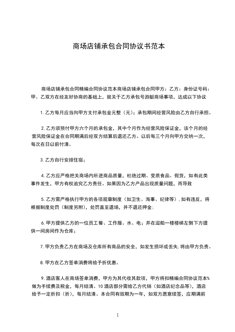 甲方:_乙方:_身份证号码:_甲、乙双方在经友好协商的基础上,就关于乙方_承包_号游艇商场事项,达成