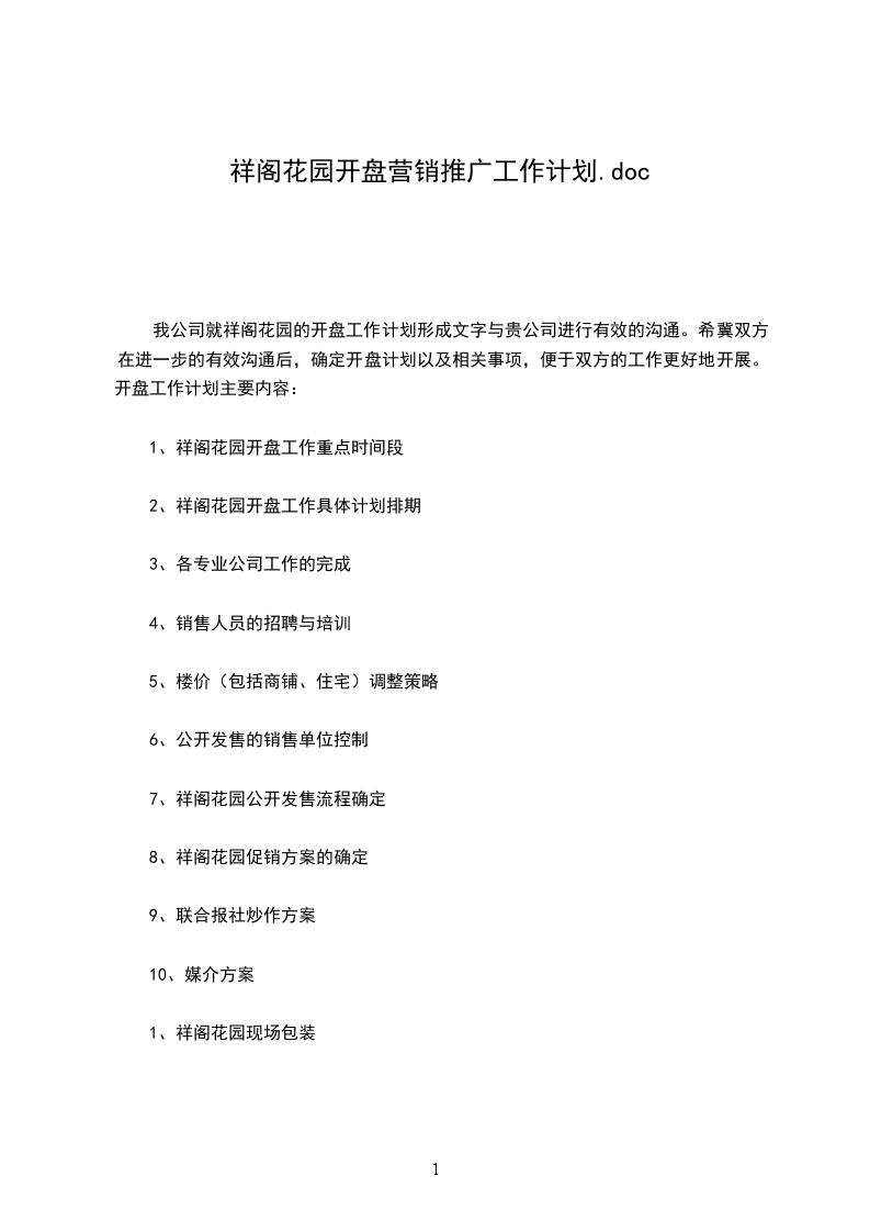 我公司就祥阁花园的开盘工作计划形成文字与贵公司进行有效的沟通。希冀双方在进一步的有效沟通后,确定开盘计划以及相关事项,便于双方的工作更好地开展。开盘工作计划主要内容: