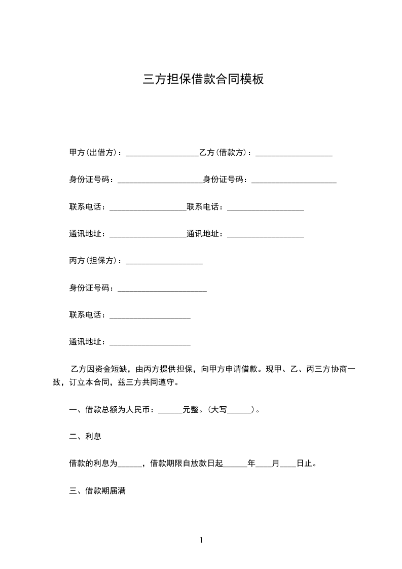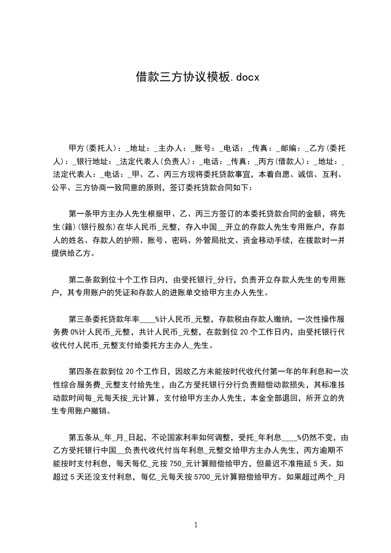 甲方(委托人):_地址:_主办人:_账号:_电话:_传真:_邮编:_乙方(委托人):_银行地址:_法定代表人(负责人):_电话:_传真:_丙方(借款人):_地址:_法定代表人:_电话:_甲、乙、丙三方现将委托贷款事宜,本着自愿、诚信、互利、公平、三方协商一致同意的原则,签订委托贷款合同如下: