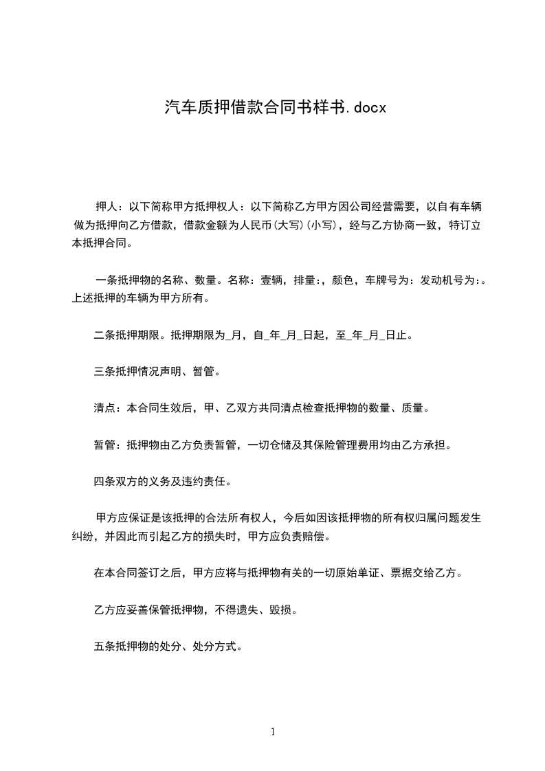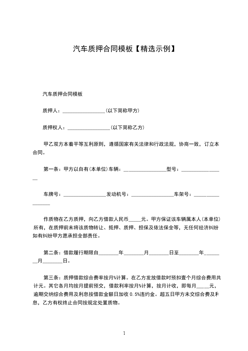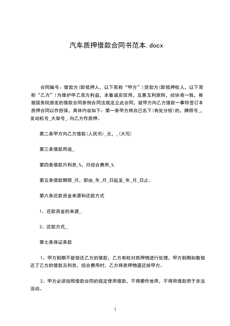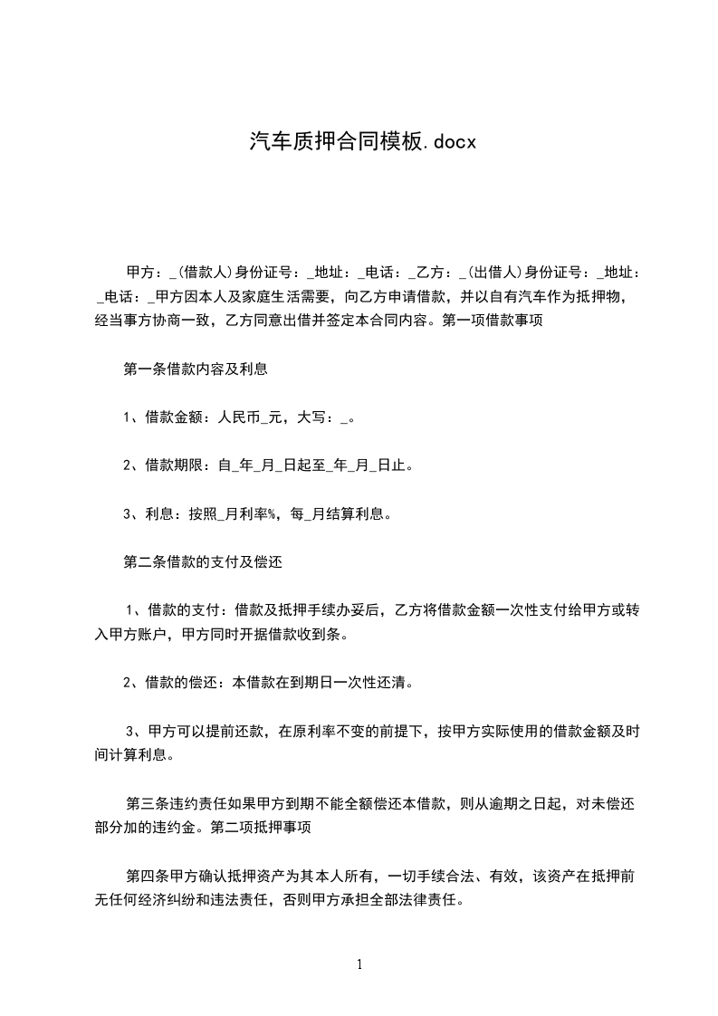 甲方:_(借款人)身份证号:_地址:_电话:_乙方:_(出借人)身份证号:_地址:_电话:_甲方因本人及家庭生活需要,向乙方申请借款,并以自有汽车作为抵押物,经当事方协商一致,乙方同意出借并签定本合同内容。第一项借款事项