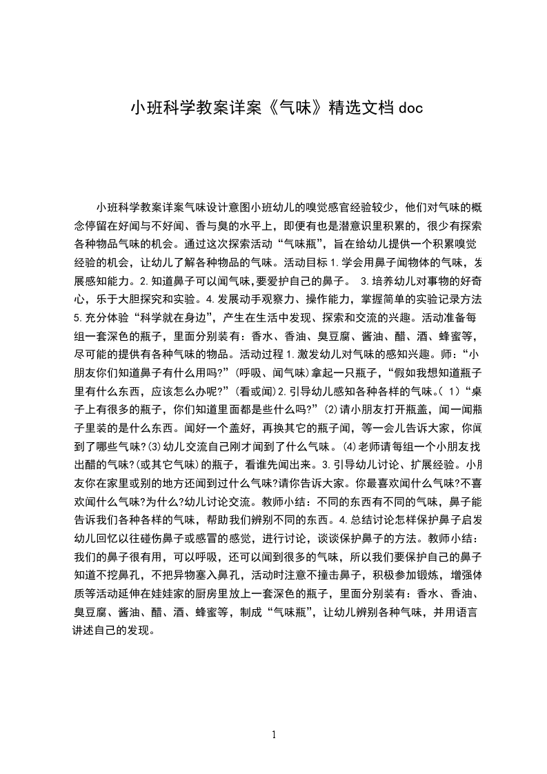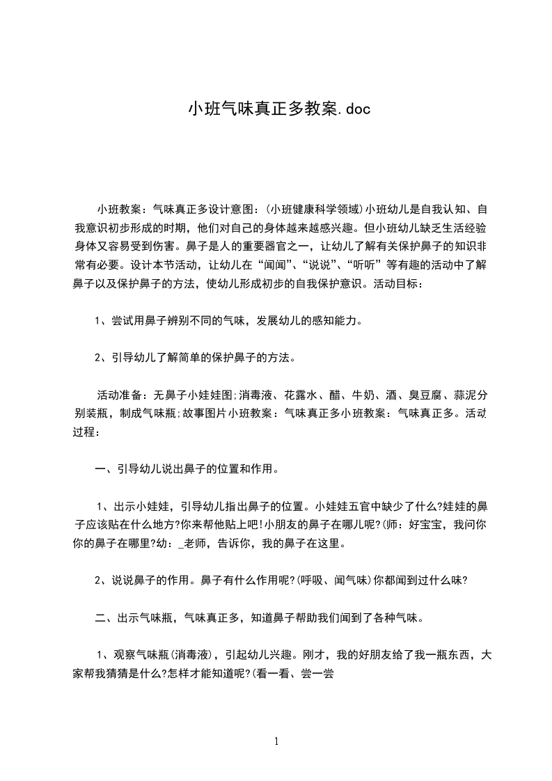 小班教案:气味真正多设计意图:(小班健康科学领域)小班幼儿是自我认知、自我意识初步形成的时期,他们对自己的身体越来越感兴趣。但小班幼儿缺乏生活经验,身体又容易受到伤害。鼻子是人的重要器官之一,让幼儿了解有关保护鼻子的知识非常有必要。设计本节活动,让幼儿在“闻闻”、“说说”、“听听”等有趣的活动中了解鼻子以及保护鼻子的方法,使幼儿形成初步的自我保护意识。活动目标: