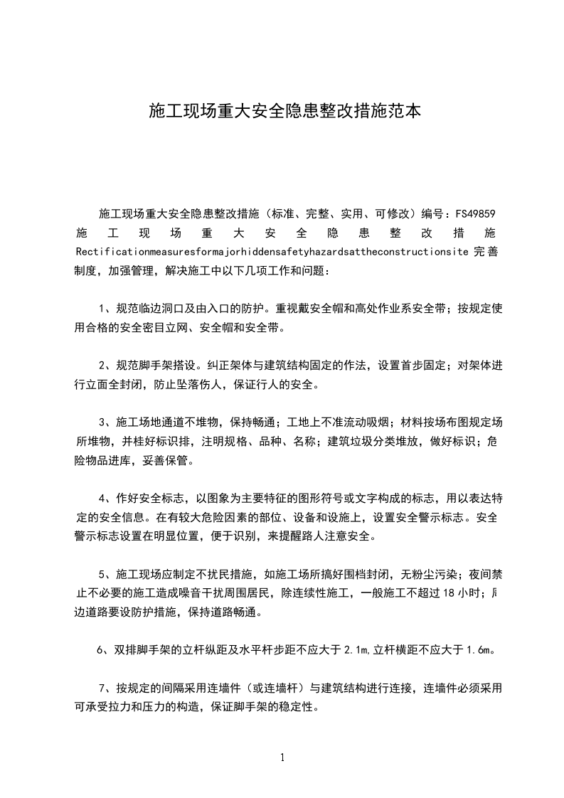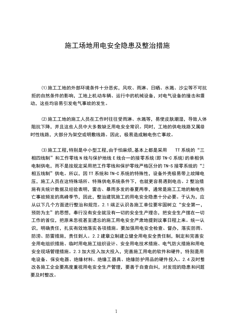 (6)悬挑梁间距应按悬挑架架体立杆纵距设置,每一纵距设置一根;型钢悬挑脚手架构造见下图:二临时用电部分通病:配电箱周围堆放过多材料,通行不便,不利于操作危害:发生紧急情况时,通行不便,不能及时断开电源;维修人员不利于操作。预防:配电箱周围不准堆放材料,尤其是易燃物。材料堆放要远离配电箱3米以上,并且要有畅通的通道。通病:使用国家明文淘汰的塑料闸刀开关(HK8)。危害:受热容易融化,绝缘性能差,容易破碎等。预防:配电箱选购或配备时,禁止使用这种开关;在后期维修时,不要使用这种开关。通病:高压线下搭设临时板房。危害:搭设板房时容易触电;恶劣天气容易造成线路摇摆,打火或线路断裂;高压线会产生强磁场,对人体有害;高压线在阴雨天与房屋产生电弧,容易造成电击。预防:临设规划时就要避开高压线,严禁在高压线下建房屋、操作棚、加工厂等。通病:临时电缆乱托乱拽,拖地乱拉乱扯。危害:电缆容易磨损、接地、漏电,造成跳闸、触电。预防:室外电缆尽量埋设,无法埋设以及室内电缆要架设起来,架设高度要不低于米,过路电缆要设置限高杆。通病:开关箱不符合要求,一闸多机,有的还接在空开上端头,起不到保护作用。危害:一闸多机会造成一台设备或线路出故障,影响多台设备运行,而且容易造成误动作;接线混乱会造成线路及设备有故障时,没有开关和漏保的保护,对上一级负荷开关产生影响,因上一级开关脱扣电流较大,容易造成线路烧毁等事故,还容易造成火灾。预防:严格按照规定配备开关箱,严格按要求接线,专职电工管理。通病:用四芯电缆外补一根电线代替五芯电缆。危害:外补电线容易受机械损伤、破损等,造成漏电或影响地线作用。预防:严格采用五芯电缆,只有不用零线的三相电设备才可以用四芯电缆通病:使用国家明文禁止的倒顺开关。危害:因倒顺开关内各相线触电距离太近,又没有灭弧罩,结构紧凑导致触电距外壳(铁质)距离太小,外壳又容易变形,非常容易造成短路、外壳连电的故障,造成触电。预防:严禁使用倒顺开关,按规定配置开关箱。通病:电缆与设备架体、脚手架等钢制结构直接连接,无绝缘措施。危害:电缆随风摆动,在架体上摩擦,容易损坏漏电,造成钢质构件或钢管带电,出线触电事故。预防:当电缆沿铁质构件敷设时,要采用瓷瓶等进行架体绝缘,电缆要绑扎牢固。当电缆沿脚手架敷设时要采取防护措施。通病:开关压线不牢固,或随时间的延长压线端子松动危害:电缆与压线端子之间松动,造成接触不良,线路发热,烧损导线绝缘层及开关的压线端子造成漏电及火灾事故。预防:压线端子一定要压紧导线,每个一段时间紧固一次。通病:线路老化。危害:绝缘程度降低,容易烧毁绝缘层造成短路;容易造成绝缘层露出线芯,造成漏电,导致触电事故。预防:敷设电缆时,要注意电缆的选择,老化电缆不要使用;平时注意电缆的维护,不要受到机械损伤、雨水浸泡、太阳暴晒等,避免加速电缆老化。通病:配电箱破损、缺少维护,接线混乱,乱接乱扯。危害:很容易造成触电事故及引发火灾。预防:加强配电箱的日常维护,严格治理乱拉乱扯的行为,严格制止乱挂线的行为。施工现场常见的安全隐患明细表种类序号内容施工现场常见的安全隐患安全管理项目经理、专职安全员、施工班组长、项目部各职能部门安全生产责任制不健全,各部门管理人员的安全生产责任制流于形式安全责任2项目部各级、各部门管理人员安全生产责任制的针对性不强,无具体的考核办法,制无考核记录3项目部未组织各工种工人学习安全操作规程;安全生产责任制不健全、不落实,各工种工人不懂各自的安全操作规程施工现场的项目部未按有关规定制订:伤亡事故控制目标、安全达标、文明施工管理目标和消安全管理目防、交通、机械设备以及环境保护管理目标标2安全管理目标管理未分解、目标执行情况无考核措施施工组织设对专业性较强、危险性较大的分部分项工程未编制专项施工组织设计计2单位工程施工组织设计中,安全措施不全面、无针对性未按专业对施工作业人员进行安全技术交底,或书面交底材料不全面、针对性不强,技术交底未按要求履行签字手续2安全技术交底没有对环境保护方面提出具体要求安全检查项目部无安全检查制度,未对现场进行安全检查2安全检查无记录、隐患整改不及时项目部未制定安全教育制度,且无具体安全教育内容对进点员工未进行安全培训教育就安排上岗作业,对换岗人员和使用“四新”人员未进行安全培训上冈作业班前活动项目部无班前活动制度,未开展班前活动或班前安全活动无记录持证上岗特种作业工作未持证上岗或持过期证件上岗工伤事故迟报、漏报、谎报和瞒报生产安全事故2未按事故处理“四不放过”原则在规定时限内处理事故安全标志施工现场无安全警示标志,或安全警示标志的布置不符合规范要求文明施工工程在市区主要路段的工地周围未设置高于的围档现场围档2一般工地围档设置高度不足米,且材料不坚固、不稳定、不整洁、不符合标准要求进入施工现场的人员佩戴工作卡不全施工场地大部分施工现场地面未做硬化处理2无排水措施或排水不通畅3大部分工地施工的泥浆未做沉淀处理4工地未设置吸烟处,随意吸烟材料堆放施工材料、构件料具不按总平面图堆放2料堆的标准牌材料名