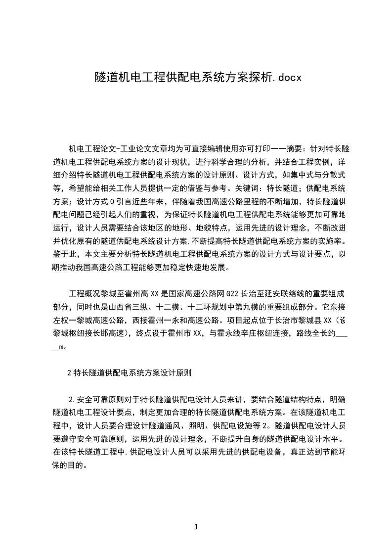 机电工程论文-工业论文文章均为可直接编辑使用亦可打印一一摘要:针对特长隧道机电工程供配电系统方案的设计现状,进行科学合理的分析,并结合工程实例,详细介绍特长隧道机电工程供配电系统方案的设计原则、设计方式,如集中式与分散式等,希望能给相关工作人员提供一定的借鉴与参考。关键词:特长隧道;供配电系统方案;设计方式0引言近些年来,伴随着我国高速公路里程的不断增加,特长隧道供配电问题己经引起人们的重视,为保证特长隧道机电工程供配电系统能够更加可靠地运行,设计人员需要结合该地区的地形、地貌特点,运用先进的设计理念,不断改进并优化原有的隧道供配电系统设计方案,不断提高特长隧道供配电系统方案的实施率。鉴于此,本文主要分析特长隧道机电工程供配电系统方案的设计方式与设计要点,以期推动我国高速公路工程能够更加稳定快速地发展。