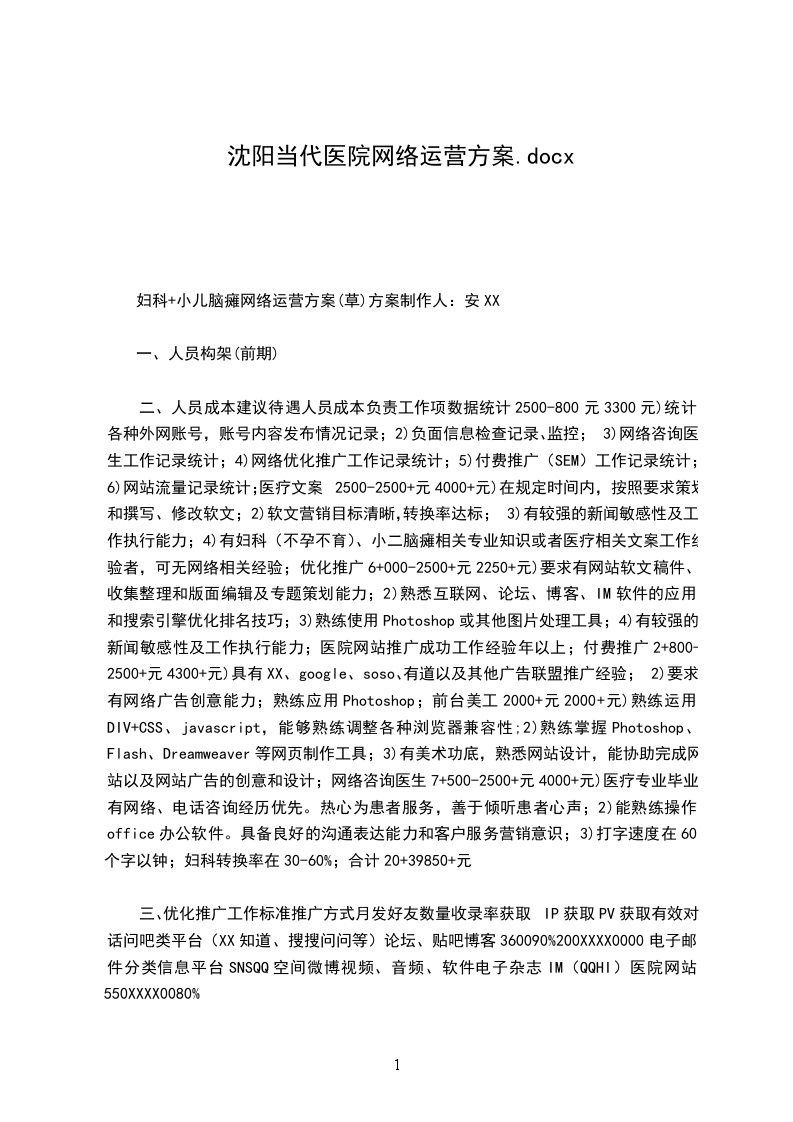 二、人员成本建议待遇人员成本负责工作项数据统计2500-800元3300元)统计各种外网账号,账号内容发布情况记录;2)负面信息检查记录、监控;3)网络咨询医生工作记录统计;4)网络优化推广工作记录统计;5)付费推广(SEM)工作记录统计;6)网站流量记录统计;医疗文案2500-2500+元4000+元)在规定时间内,按照要求策划和撰写、修改软文;2)软文营销目标清晰,转换率达标;3)有较强的新闻敏感性及工作执行能力;4)有妇科(不孕不育)、小二脑瘫相关专业知识或者医疗相关文案工作经验者,可无网络相关经验;优化推广6+000-2500+元2250+元)要求有网站软文稿件、收集整理和版面编辑及专题策划能力;2)熟悉互联网、论坛、博客、IM软件的应用和搜索引擎优化排名技巧;3)熟练使用Photoshop或其他图片处理工具;4)有较强的新闻敏感性及工作执行能力;医院网站推广成功工作经验年以上;付费推广2+800-2500+元4300+元)具有XX、google、soso、有道以及其他广告联盟推广经验;2)要求有网络广告创意能力;熟练应用Photoshop;前台美工2000+元2000+元)熟练运用DIV+CSS、javascript,能够熟练调整各种浏览器兼容性;2)熟练掌握Photoshop、Flash、Dreamweaver等网页制作工具;3)有美术功底,熟悉网站设计,能协助完成网站以及网站广告的创意和设计;网络咨询医生7+500-2500+元4000+元)医疗专业毕业,有网络、电话咨询经历优先。热心为患者服务,善于倾听患者心声;2)能熟练操作office办公软件。具备良好的沟通表达能力和客户服务营销意识;3)打字速度在60个字以钟;妇科转换率在30-60%;合计20+39850+元